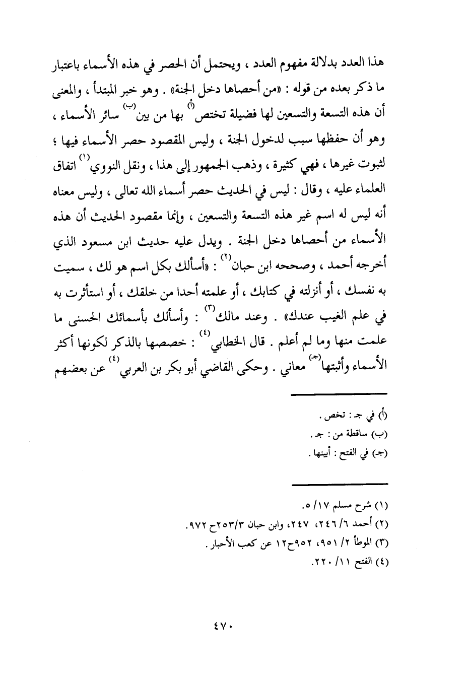 هذا العدد بدلالة مفهوم العدد، ويحتمل أن الحصر في هذه الأسماء باعتبار ما ذكر بعده من قوله: "من أحصاها دخل الجنة". وهو خبر المبتدأ، والمعنى أن هذه التسعة والتسعين لها فضيلة تختص (أ) بها من بين (ب) سائر الأسماء، وهو أن حفظها سبب لدخول الجنة، وليس المقصود حصر الأسماء فيها؛ لثبوت غيرها، فهي كثيرة، وذهب الجمهور إلى هذا، ونقل النووي (¬1) اتفاق العلماء عليه، وقال: ليس في الحديث حصر أسماء الله تعالى، وليس معناه أنه ليس له اسم غير هذه التسعة والتسعنِن، وإنما مقصود الحديث أن هذه الأسماء من أحصاها دخل الجنة. ويدل عليه حديث ابن مسعود الذي أخرجه أحمد، وصححه ابن حبان (¬2): "أسألك بكل اسم هو لك، سميت به نفسك، أو أنزلته في كتابك، أو علمته أحدا من خلقك، أو استأثرت به في علم الغيب عندك". وعند مالك (¬3): وأسألك بأسمائك الحسنى ما علمت منها وما لم أعلم. قال الخطابي (¬4): خصصها بالذكر لكونها أكثر الأسماء وأثبتها (جـ) معاني. وحكى القاضي أبو بكر بن العربي (4) عن بعضهم