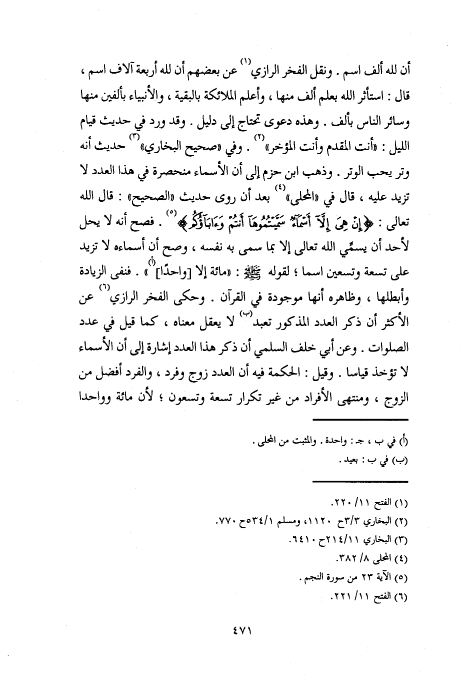 أن لله ألف اسم. ونقل الفخر الرازي (¬1) عن بعضهم أن لله أربعة آلاف اسم، قال: استأثر الله بعلم ألف منها، وأعلم الملائكة بالبقية، والأنبياء بألفين منها وسائر الناس بألف. وهذه دعوى تحتاج إلى دليل. وقد ورد في حديث قيام الليل: "أنت المقدم وأنت المؤخر" (¬2). وفي "صحيح البخاري" (¬3) حديث أنه وتر يحب الوتر. وذهب ابن حزم إلى أن الأسماء منحصرة في هذا العدد لا تزيد عليه، قال في "المحلى" (¬4) بعد أن روى حديث "الصحيح": قال الله تعالى: {إِنْ هِيَ إلا أَسْمَاءٌ سَمَّيْتُمُوهَا أَنْتُمْ وَآبَاؤُكُمْ} (¬5). فصح أنه لا يحل لأحد أن يسمَّي الله تعالى إلا بما سمى به نفسه، وصح أن أسماءه لا تزيد على تسعة وتسعين اسما؛ لقوله - صلى الله عليه وسلم -: "مائة إلا [واحدًا] (أ) ". فنفى الزيادة وأبطلها، وظاهره أنها موجودة في القرآن. وحكى الفخر الرازي (¬6) عن الأكثر أن ذكر العدد المذكور تعبد (ب) لا يعقل معناه، كما قيل في عدد الصلوات. وعن أبي خلف السلمي أن ذكر هذا العدد إشارة إلى أن الأسماء لا تؤخذ قياسا. وقيل: الحكمة فيه أن العدد زوج وفرد، والفرد أفضل من الزوج، ومنتهى الأفراد من غير تكرار تسعة وتسعون؛ لأن مائة وواحدا