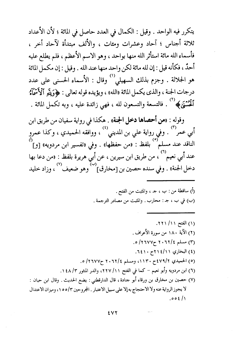 وقوله: "من أحصاها دخل الجنة". هكذا في رواية سفيان من طريق ابن أبي عمر (¬3). وفي رواية علي بن المديني (¬4)، ووافقه الحميدي، وكذا عمرو الناقد عند مسلم (¬5) بلفظ: "من حفظها". وفي "تفسير ابن مردويه" [و] (أ) عند أبي نعيم (¬6)، من طريق ابن سيرين، عن أبي هريرة بلفظ: "من دعا بها دخل الجنة". وفي سنده حصين بن [مخارق] (ب) وهو ضعيف (¬7)، وزاد خليد