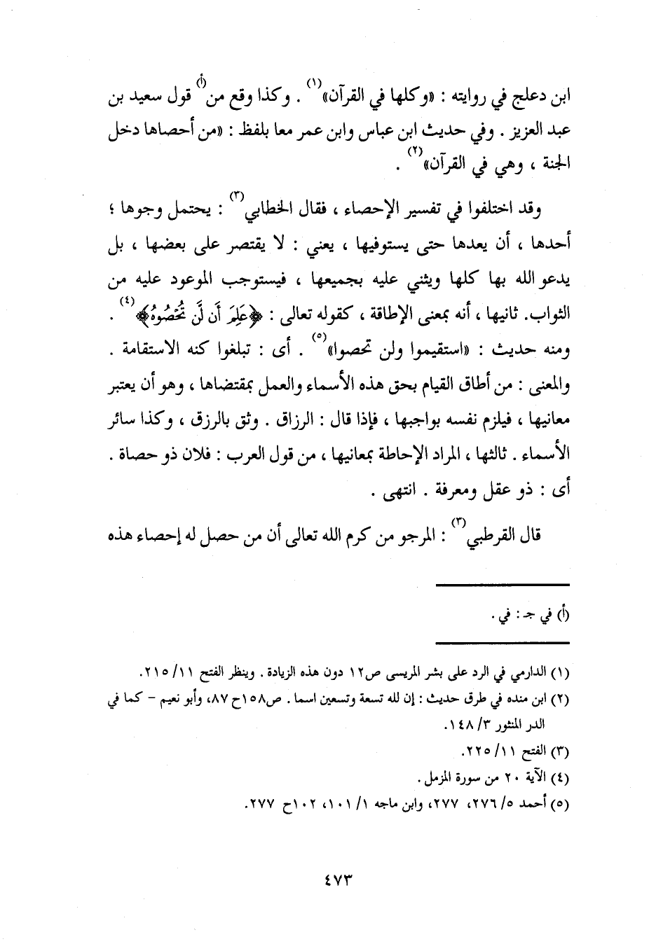 ابن دعلج في روايته: "وكلها في القرآن" (¬1). وكذا وقع من (أ) قول سعيد بن عبد العزيز. وفي حديث ابن عباس وابن عمر معا بلفظ: "من أحصاها دخل الجنة، وهي في القرآن" (¬2).