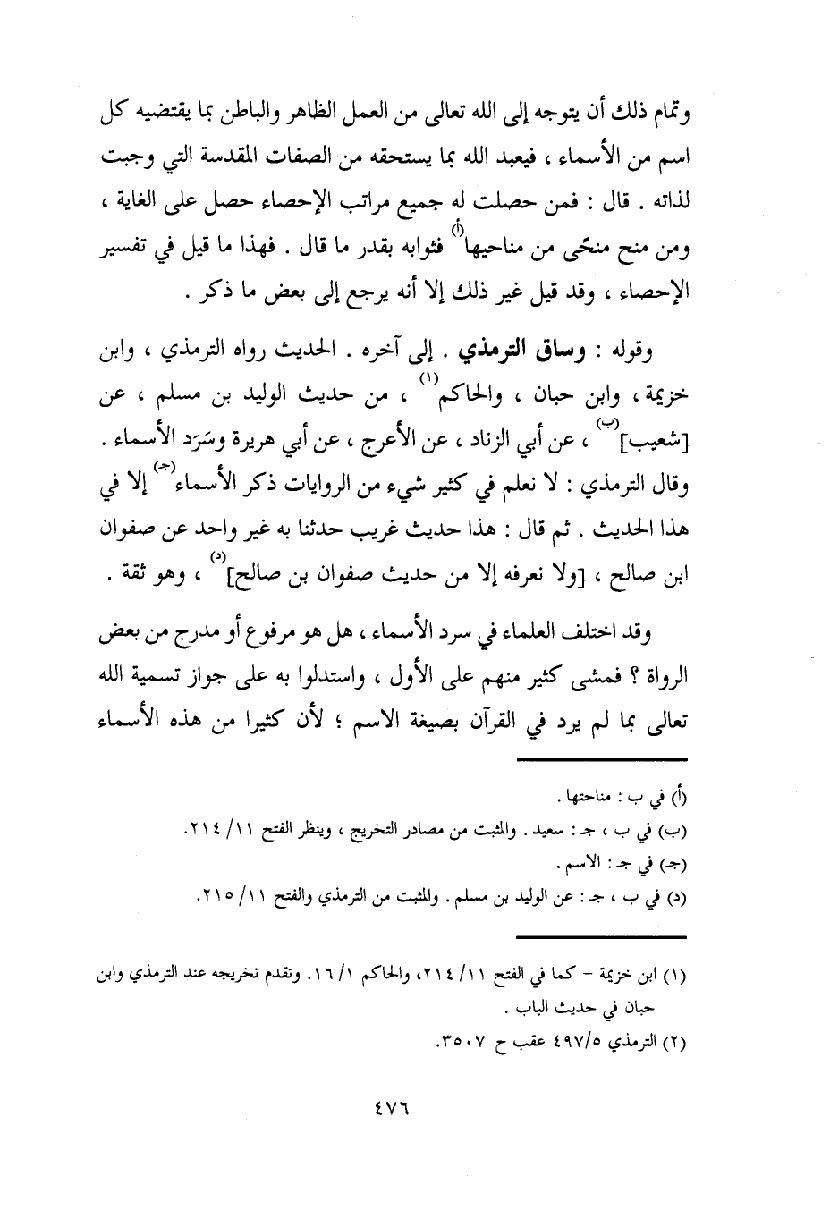 وتمام ذلك أن يتوجه إلى الله تعالى من العمل الظاهر والباطن بما يقتضيه كل اسم من الأسماء، فيعبد الله بما يستحقه من الصفات المقدسة التي وجبت لذاته. قال: فمن حصلت له جميع مراتب الإحصاء حصل على الغاية، ومن منح منحًى من مناحيها (أ) فثوابه بقدر ما قال. فهذا ما قيل في تفسير الإحصاء، وقد قيل غير ذلك إلا أنه يرجع إلى بعض ما ذكر.