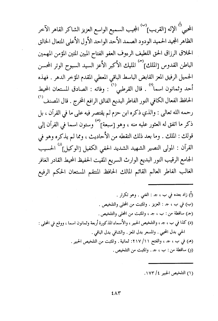 (د) كذا في ب، جـ، والتلخيص الحبير، والأسماء المذكورة أربعة وثمانون اسما، ووقع في المحلى: الحىِ بدل المحيي. والمسعر بدل المعز. والشافي بدل الباقي.