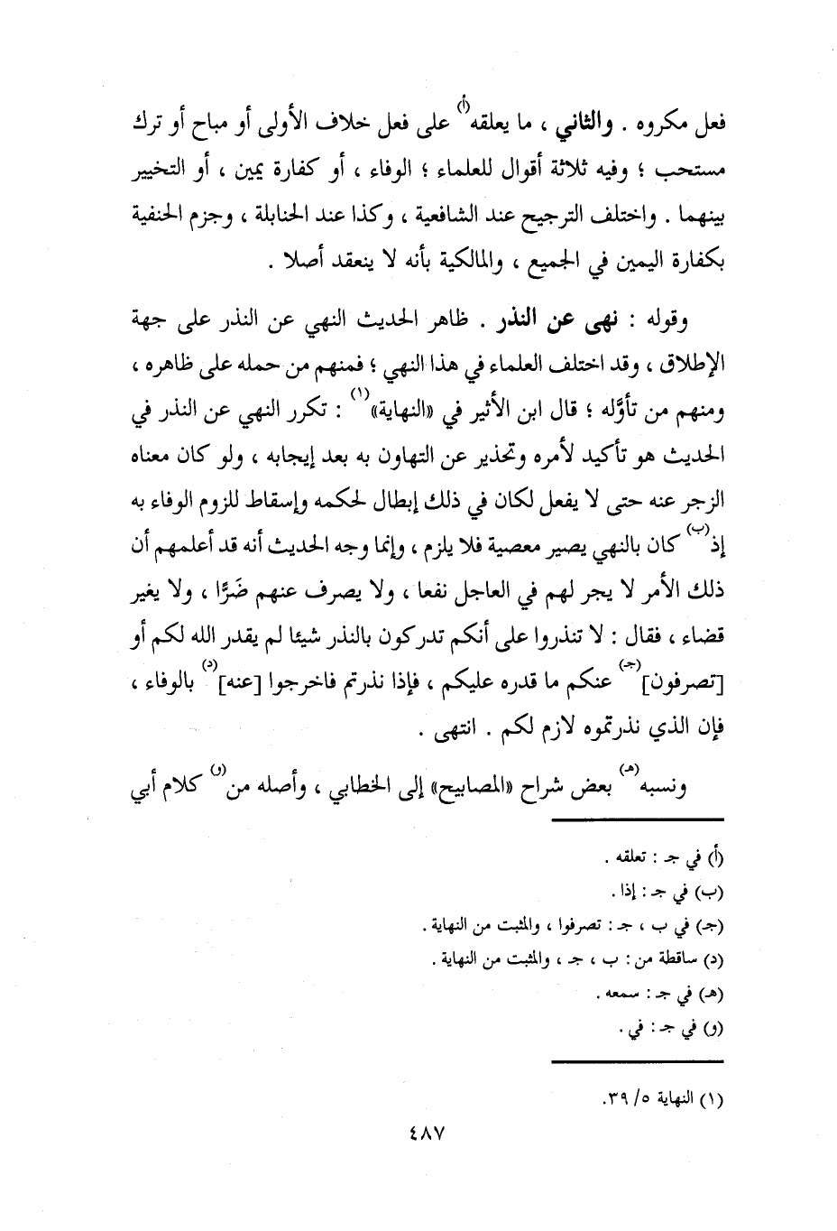 فعل مكروه. والثاني، ما يعلقه (أ) على فعل خلاف الأولى أو مباح أو ترك مستحب؛ وفيه ثلاثة أقوال للعلماء؛ الوفاء، أو كفارة يمين، أو التخيير بينهما. واختلف الترجيح عند الشافعية، وكذا عند الحنابلة، وجزم الحنفية بكفارة اليمين في الجميع، والمالكية بأنه لا ينعقد أصلا.
