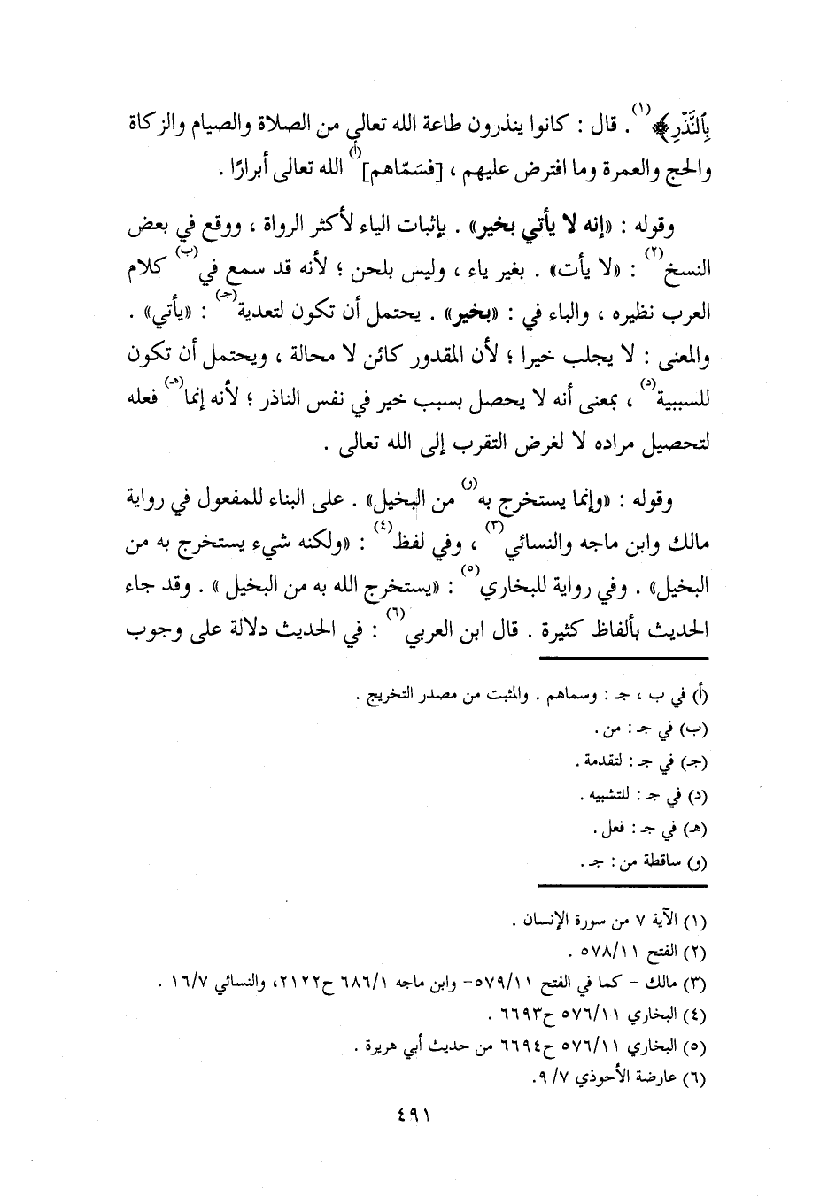 وقوله: "إنه لا يأتي بخير". بإثبات الياء لأكثر الرواة، ووقع في بعض النسخ (¬2): "لا يأت". بغير ياء، وليس بلحن، لأنه قد سمع في (ب) كلام العرب نظيره، والباء في: "بخير". يحتمل أن تكون لتعدية (جـ): "يأتي". والمعنى: لا يجلب خيرا؛ لأن المقدور كائن لا محالة، ويحتمل أن تكون للسببية (د)، بمعنى أنه لا يحصل بسبب خير في نفس الناذر، لأنه إنما (هـ) فعله لتحصيل مراده لا لغرض التقرب إلى الله تعالى.