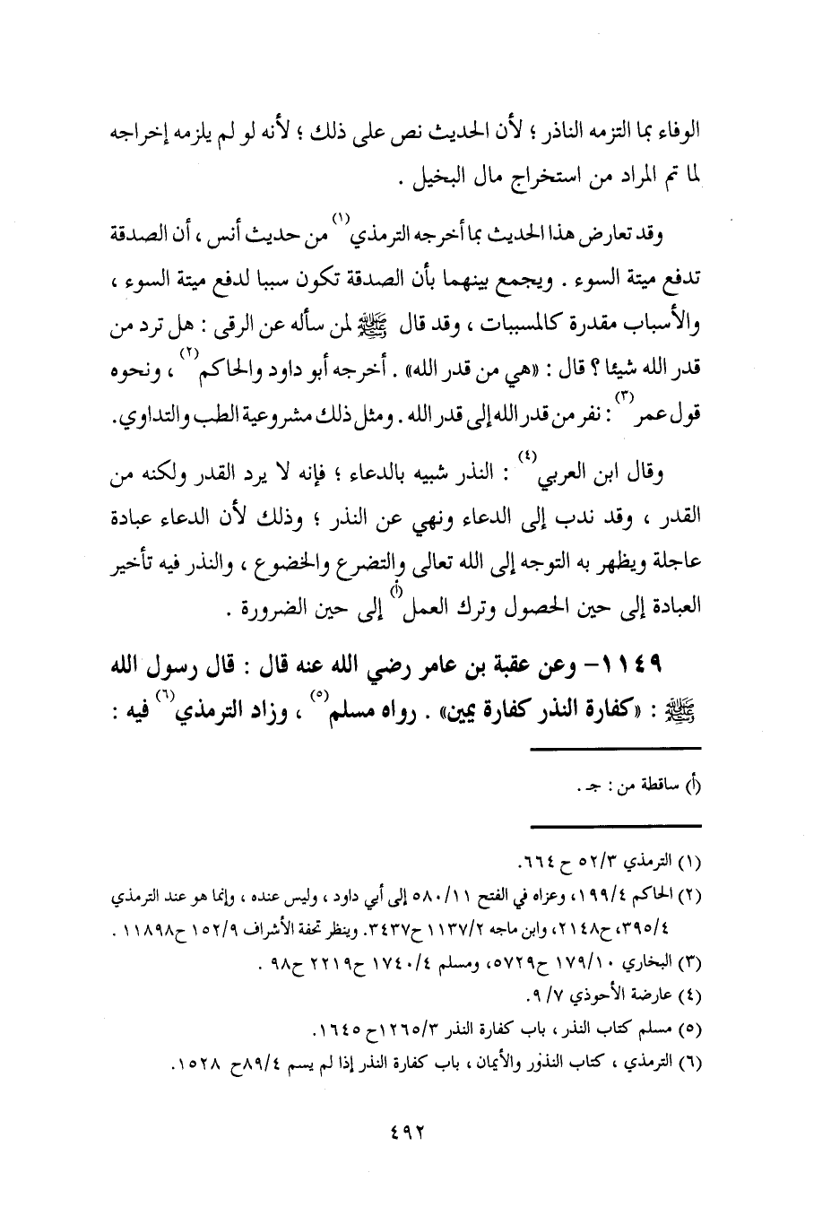 1149 - وعن عقبة بن عامر رضي الله عنه قال: قال رسول الله - صلى الله عليه وسلم -: "كفارة النذر كفارة يمين". رواه مسلم (¬5)، وزاد الترمذي (¬6) فيه: