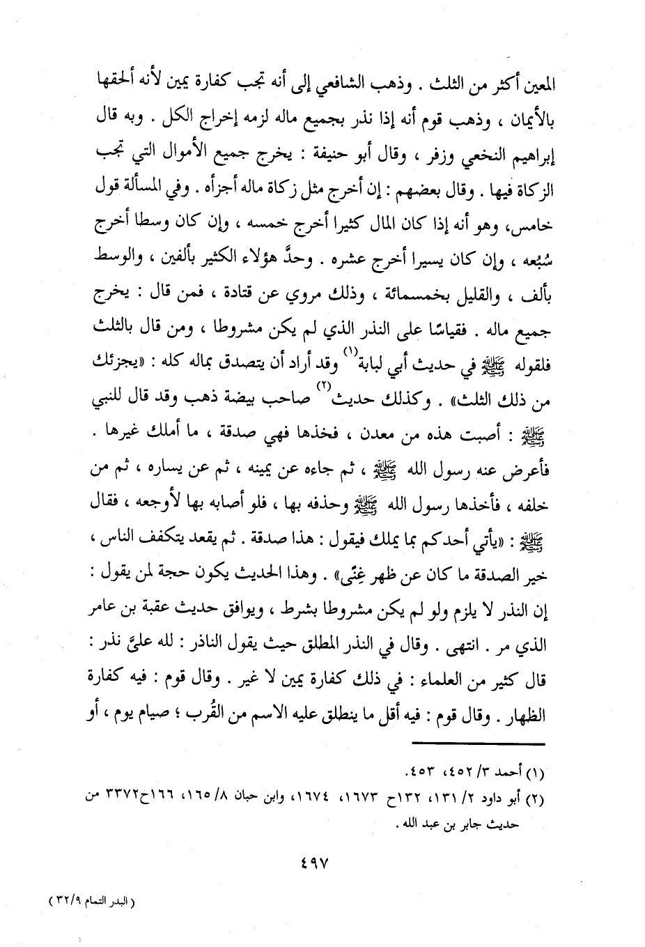 المعين أكثر من الثلث. وذهب الشافعي إلى أنه تجب كفارة يمين لأنه ألحقها بالأيمان، وذهب قوم أنه إذا نذر بجميع ماله لزمه إخراج الكل. وبه قال إبراهيم النخعي وزفر، وقال أبو حنيفة: يخرج جميع الأموال التي تحب الزكاة فيها. وقال بعضهم: إن أخرج مثل زكاة ماله أجزأه. وفي المسألة قول خامس، وهو أنه إذا كان المال كثيرا أخرج خمسه، وإن كان وسطا أخرج سُبُعه، وإن كان يسيرا أخرج عشره. وحدَّ هؤلاء الكثير بألفين، والوسط بألف، والقليل بخمسمائة، وذلك مروي عن قتادة، فمن قال: يخرج جميع ماله. فقياسًا على النذر الذي لم يكن مشروطا، ومن قال بالثلث فلقوله - صلى الله عليه وسلم - في حديث أبي لبابة (¬1) وقد أراد أن يتصدق بماله كله: "يجزئك من ذلك الثلث". وكذلك حديث (¬2) صاحب بيضة ذهب وقد قال للنبي - صلى الله عليه وسلم -: أصبت هذه من معدن، فخذها فهي صدقة، ما أملك غيرها. فأعرض عنه رسول الله - صلى الله عليه وسلم -، ثم جاءه عن يمينه، ثم عن يساره، ثم من خلفه، فأخذها رسول الله - صلى الله عليه وسلم - وحذفه بها، فلو أصابه بها لأوجعه، فقال - صلى الله عليه وسلم -: "يأتي أحدكم بما يملك فيقول: هذا صدقة. ثم يقعد يتكفف الناس، خير الصدقة ما كان عن ظهر غِنى". وهذا الحديث يكون حجة لمن يقول: إن النذر لا يلزم ولو لم يكن مشروطا بشرط، ويوافق حديث عقبة بن عامر الذي مر. انتهى. وقال في النذر المطلق حيث يقول الناذر: لله عليَّ نذر: قال كثير من العلماء: في ذلك كفارة يمين لا غير. وقال قوم: فيه كفارة الظهار. وقال قوم: فيه أقل ما ينطلق عليه الاسم من القُرب؛ صيام يوم، أو