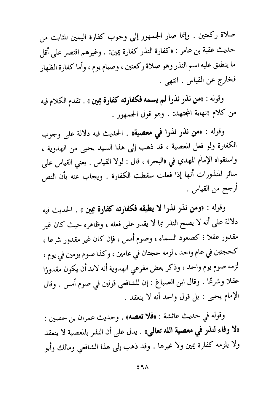 صلاة ركعتين. وإنما صار الجمهور إلى وجوب كفارة اليمين للثابت من حديث عقبة بن عامر: "كفارة النذر كفارة يمين". وغيرهم اقتصر على أقل ما ينطلق عليه اسم النذر وهو صلاة ركعتين، وصيام يوم، وأما كفارة الظهار فخارج عن القياس. انتهى.