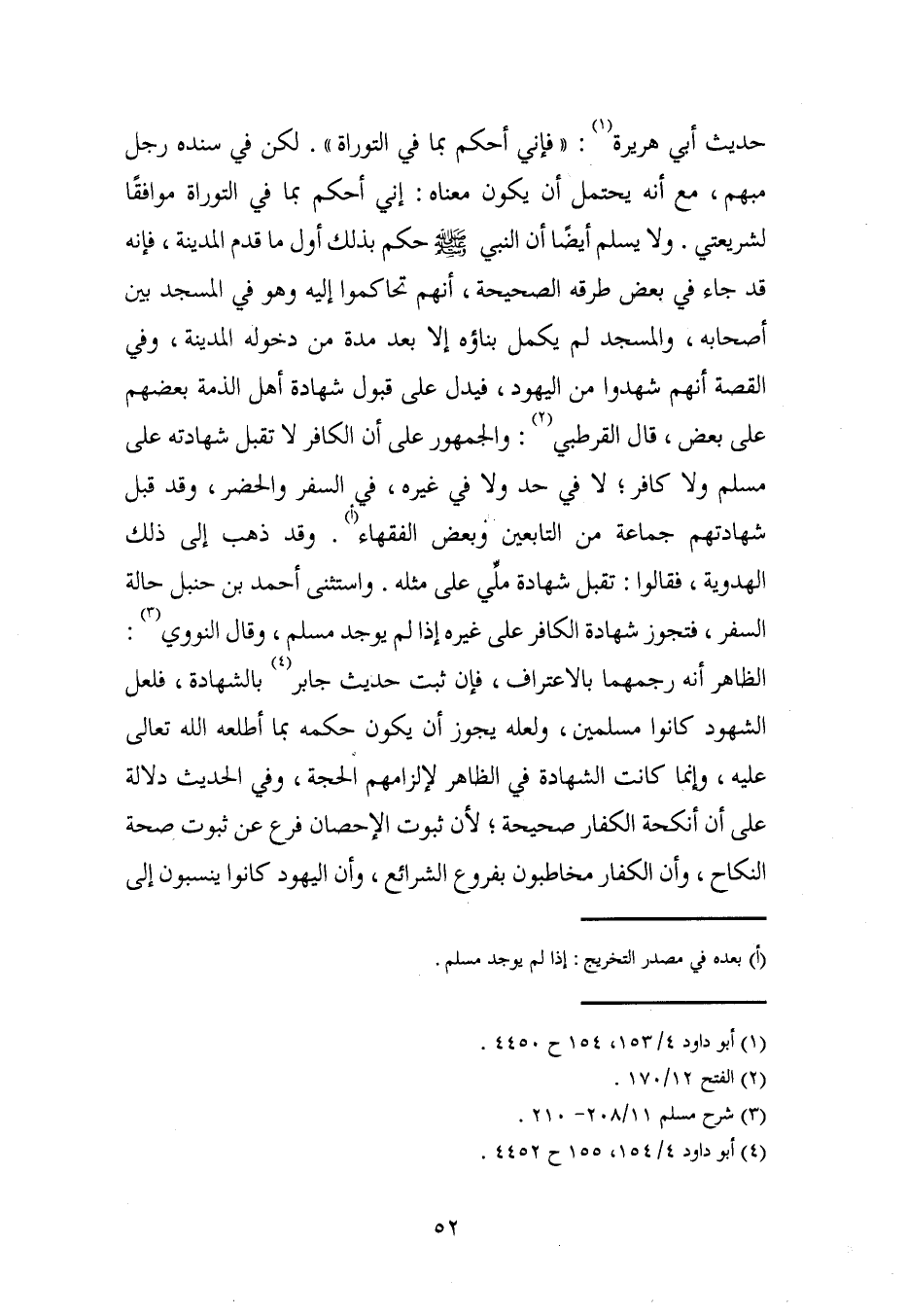 حديث أبي هريرة (¬1): "فإني أحكم بما في التوراة". لكن في سنده رجل مبهم، مع أنه يحتمل أن يكون معناه: إني أحكم بما في التوراة موافقًا لشريعتي. ولا يسلم أيضًا أن النبي - صلى الله عليه وسلم - حكم بذلك أول ما قدم المدينة، فإنه قد جاء في بعض طرقه الصحيحة، أنهم تحاكموا إليه وهو في المسجد بين أصحابه، والمسجد لم يكمل بناؤه إلا بعد مدة من دخوله المدينة، وفي القصة أنهم شهدوا من اليهود، فيدل على قبول شهادة أهل الذمة بعضهم على بعض، قال القرطبي (¬2): والجمهور على أن الكافر لا تقبل شهادته على مسلم ولا كافر؛ لا في حد ولا في غيره، في السفر والحضر، وقد قبل شهادتهم جماعة من التابعين ؤبعض الفقهاء (أ). وقد ذهب إلى ذلك الهدوية، فقالوا: تقبل شهادة ملِّي على مثله. واستثنى أحمد بن حنبل حالة السفر، فتجوز شهادة الكافر على غيره إذا لم يوجد مسلم، وقال النووي (¬3): الظاهر أنه رجمهما بالاعتراف، فإن ثبت حديث جابر (¬4) بالشهادة، فلعل الشهود كانوا مسلمين، ولعله يجوز أن يكون حكمه بما أطلعه الله تعالى عليه، وإنما كانت الشهادة في الظاهر لإلزامهم الحجة، وفي الحديث دلالة على أن أنكحة الكفار صحيحة؛ لأن ثبوت الإحصان فرع عن ثبوت صحة النكاح، وأن الكفار مخاطبون بفروع الشرائع، وأن اليهود كانوا ينسبون إلى