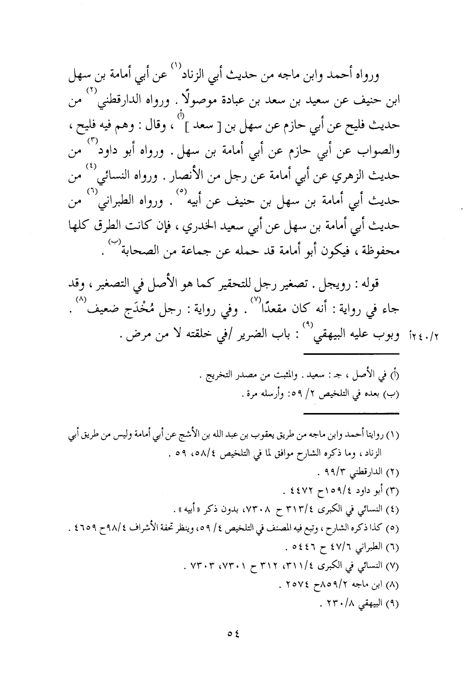 (¬1) روايتا أحمد وابن ماجه من طريق يعقوب بن عبد الله بن الأشج عن أبي أمامة وليس من طريق أبي الزناد، وما ذكره الشارح موافق لما في التلخيص 4/ 58، 59.