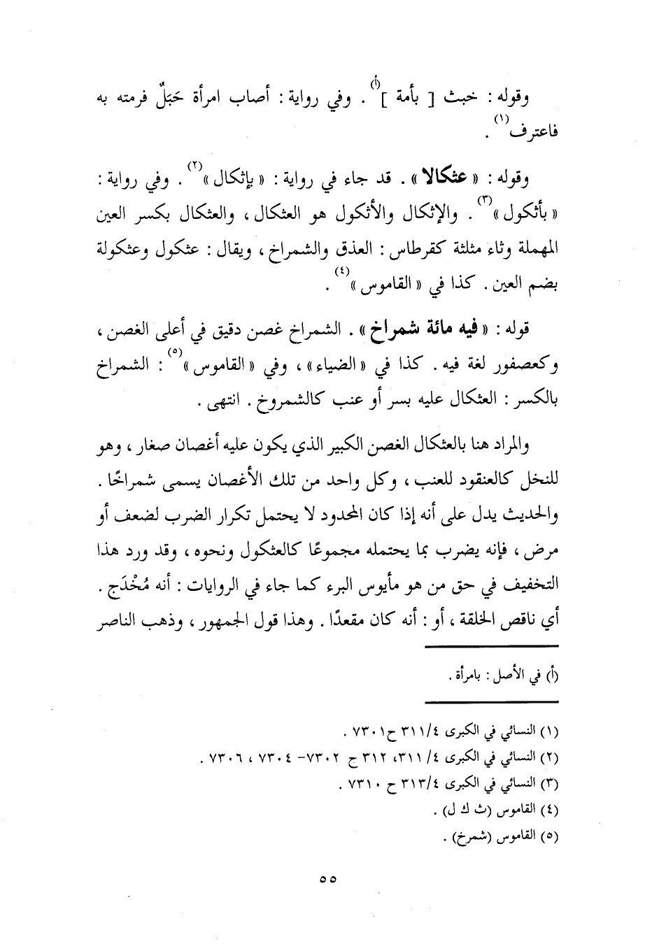 والمراد هنا بالعثكال الغصن الكبير الذي يكون عليه أغصان صغار، وهو للنخل كالعنقود للعنب، وكل واحد من تللث الأغصان يسمى شمراخًا. والحديث يدل على أنه إذا كان المحدود لا يحتمل تكرار الضرب لضعف أو مرض، فإنه يضرب بما يحتمله مجموعًا كالعثكول ونحوه، وقد ورد هذا التخفيف في حق من هو مأيوس البرء كما جاء في الروايات: أنه مُخْدَج. أي ناقص الخلقة، أو: أنه كان مقعدًا. وهذا قول الجمهور، وذهب الناصر