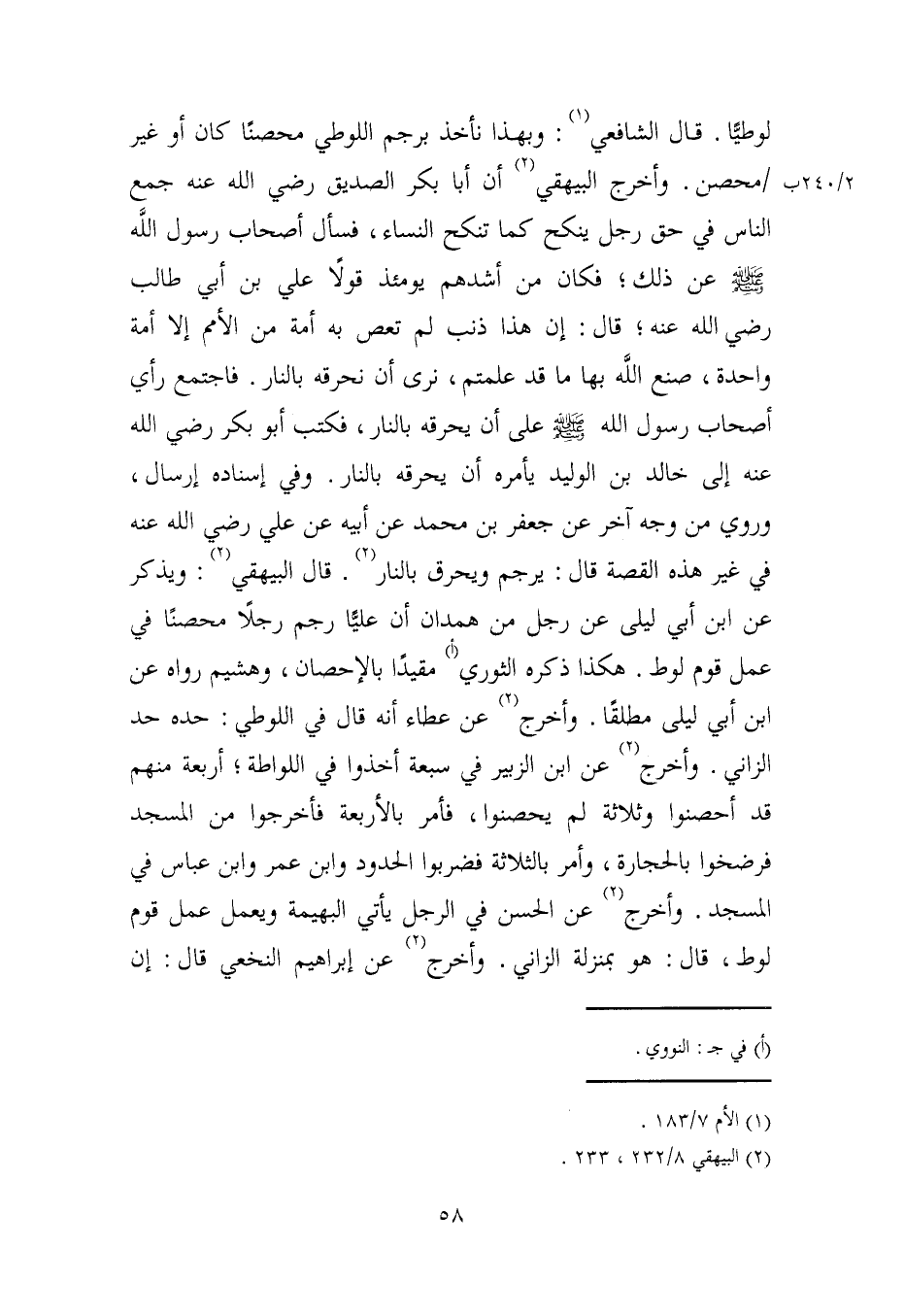لوطيًّا. قال الشافعي (¬1): وبهذا نأخذ برجم اللوطي محصنًا كان أو غير محصن. وأخرج البيهقي (¬2) أن أبا بكر الصديق رضي الله عنه جمع الناس في حق رجل ينكح كما تنكح النساء، فسأل أصحاب رسول اللَّه - صلى الله عليه وسلم - عن ذلك؛ فكان من أشدهم يومئذ قولًا علي بن أبي طالب رضي الله عنه، قال: إن هذا ذنب لم تعص به أمة من الأم إلا أمة واحدة، صنع اللَّه بها ما قد علمتم، نرى أن نحرقه بالنار. فاجتمع رأي أصحاب رسول الله - صلى الله عليه وسلم - على أن يحرقه بالنار، فكتب أبو بكر رضي الله عنه إلى خالد بن الوليد يأمره أن يحرقه بالنار. وفي إسناده إرسال، وروي من وجه آخر عن جعفر بن محمد عن أبيه عن علي رضي الله عنه في غير هذه القصة قال: يرجم ويحرق بالنار (2). قال البيهقي (2): ويذكر عن ابن أبي ليلى عن رجل من همدان أن عليًّا رجم رجلًا محصنًا في عمل قوم لوط. هكذا ذكره الثوري (1) مقيدًا بالإحصان، وهشيم رواه عن ابن أبي ليلى مطلقًا. وأخرج (2) عن عطاء أنه قال في اللوطي: حده حد الزاني. وأخرج (2) عن ابن الزبير في سبعة أخذوا في اللواطة، أربعة منهم قد أحصنوا وثلاثة لم يحصنوا، فأمر بالأربعة فأخرجوا من المسجد فرضخوا بالحجارة، وأمر بالثلاثة فضربوا الحدود وابن عمر وابن عباس في المسجد. وأخرج (2) عن الحسن في الرجل يأتي البهيمة ويعمل عمل قوم لوط، قال: هو بمنزلة الزاني. وأخرج (2) عن إبراهيم النخعي قال: إن