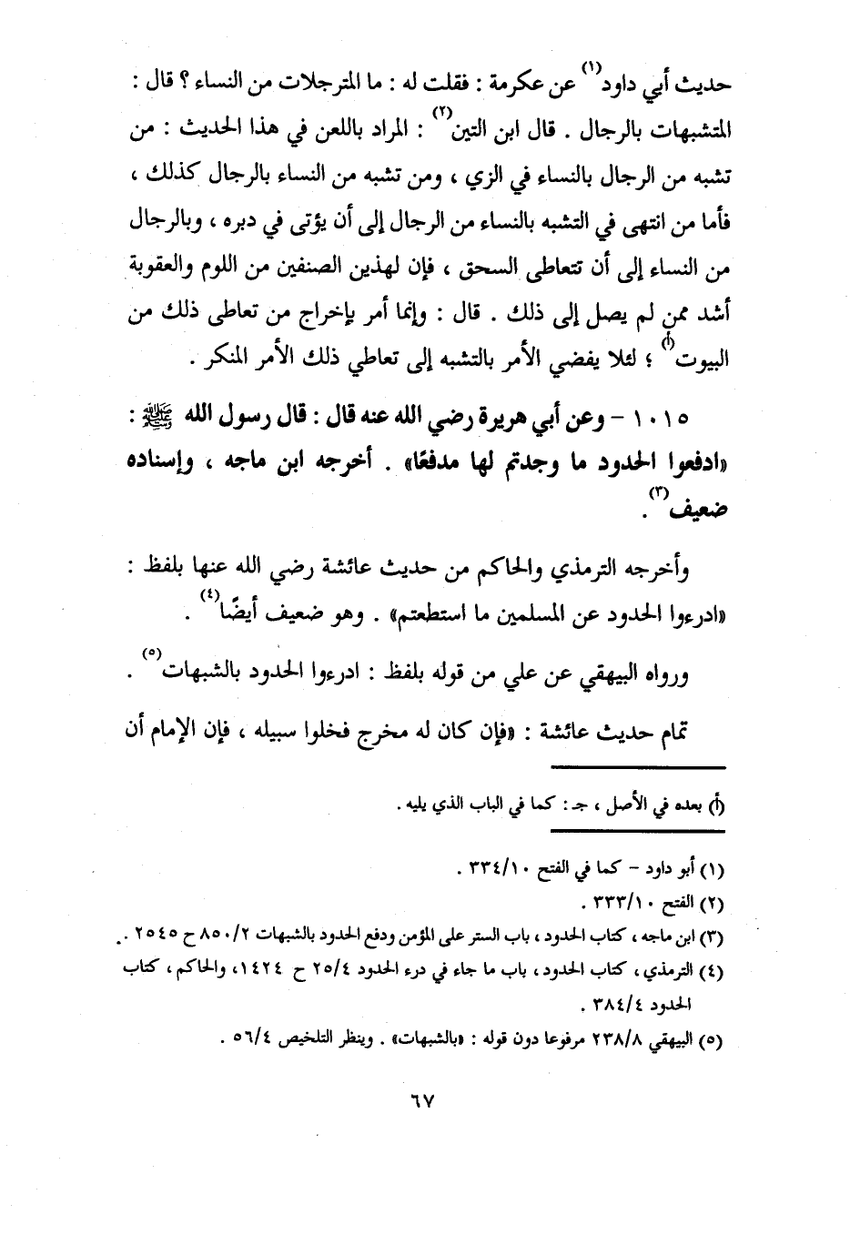 1015 - وعن أبي هريرة رضي الله عنه قال: قال رسول الله - صلى الله عليه وسلم -: "ادفعوا الحدود ما وجدتم لها مدفعًا". أخرجه ابن ماجه، وإسناده ضعيف (¬3).