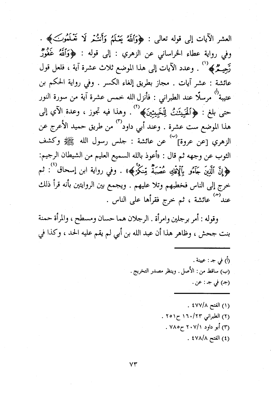 وفي رواية عطاء الخراساني عن الزهريّ: إلى قوله: {وَاللَّهَ غفور رَحِيمٌ} (¬1). وعدد الآيات إلى هذا الموضع ثلاث عشرة آية، فلعل قول عائشة: عشر آيات. مجاز بطريق إلغاء الكسر. وفي رواية الحكم بن عتيبة (أ) مرسلًا عند الطبراني: فأنزل الله خمس عشرة آية من سورة النور حتى بلغ: {الْخَبِيثَاتُ لِلْخَبِيثِينَ} (¬2). وهذا فيه تجوز، وعدة الآي إلى هذا الموضع ست عشرة. وعند أبي داود (¬3) من طريق حميد الأعرج عن الزهريّ [عن عروة] (ب) عن عائشة: جلس رسول الله - صلى الله عليه وسلم - وكشف الثوب عن وجهه ثم قال: "أعوذ بالله السميع العليم من الشيطان الرجيم: {إِنَّ الَّذِينَ جَاءُوا بِالْإِفْكِ عُصْبَةٌ مِنْكُمْ}. وفي رواية ابن إسحاق (¬4): ثم خرج إلى الناس فخطبهم وتلا عليهم. ويجمع بين الروايتين بأنه قرأ ذلك عند (جـ) عائشة، ثم خرج فقرأها على الناس.