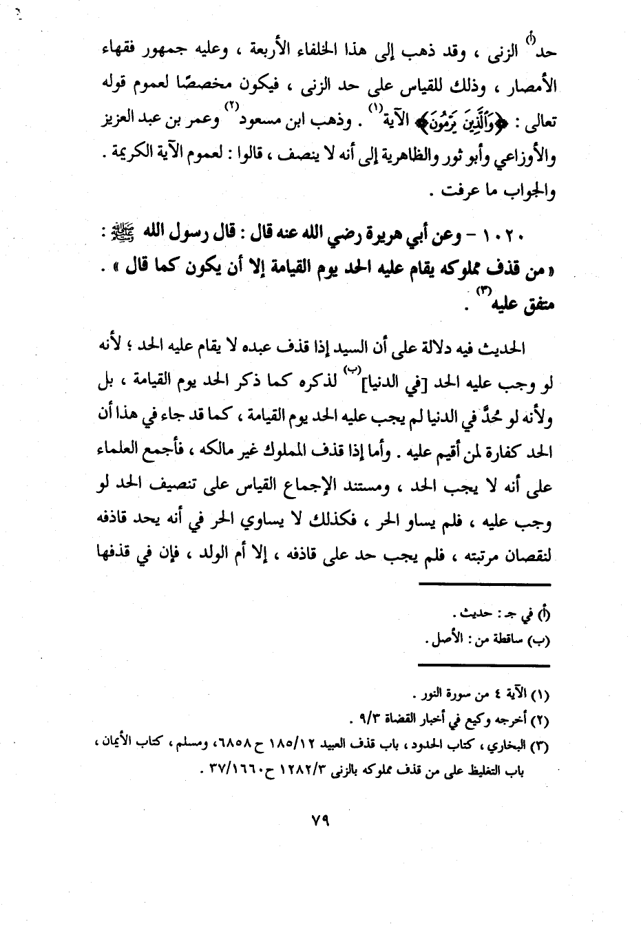 (¬3) البخاري، كتاب الحدود، باب قذف العبيد 12/ 185 ح 6858، ومسلم، كتاب الأيمان، باب التغليظ على من قذف مملوكه بالزنى 3/ 1283 ح 1660/ 37.