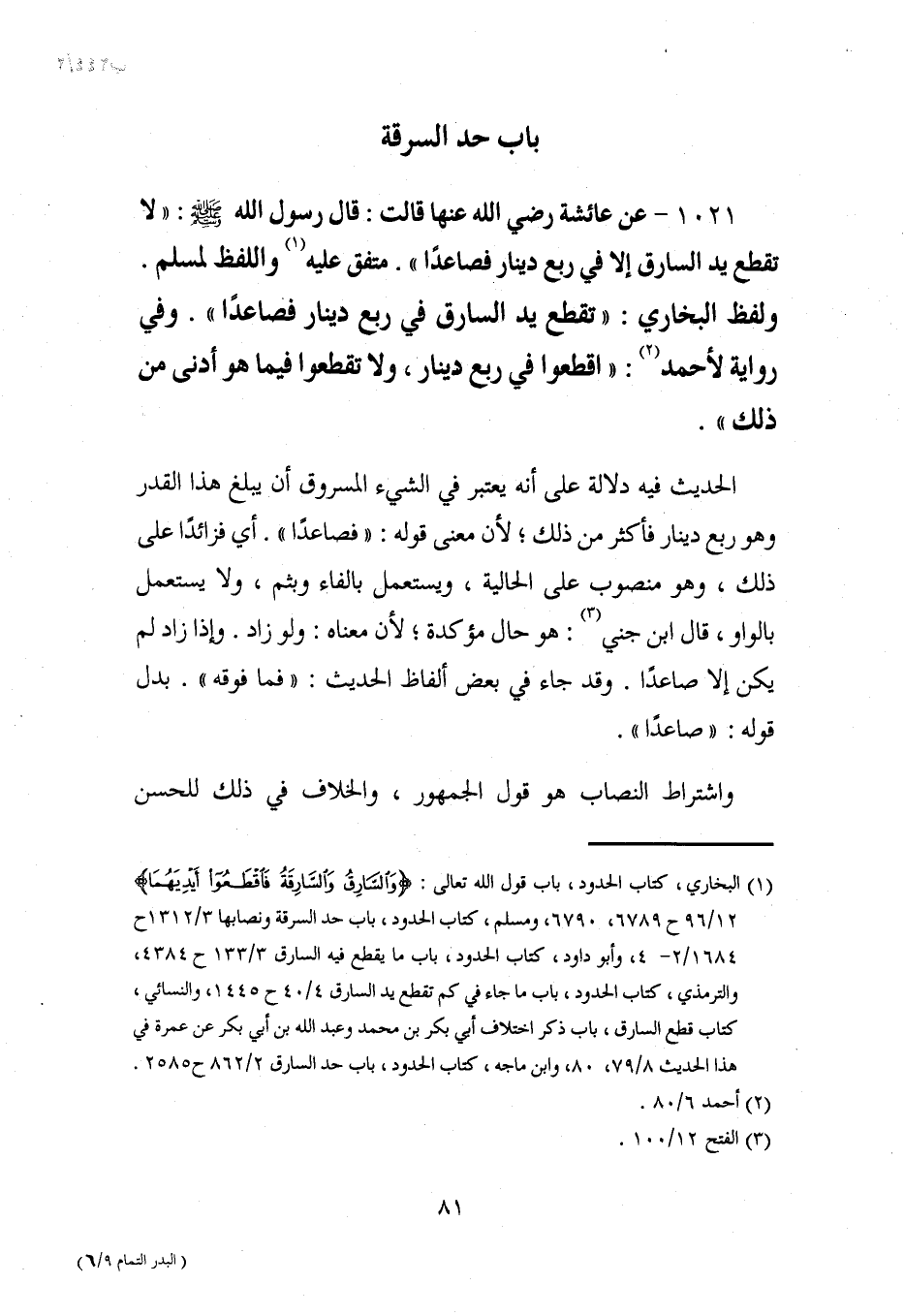 1021 - عن عائشة رضي الله عنها قالت: قال رسول الله - صلى الله عليه وسلم -: "لا تقطع يد السارق إلا في ربع دينار فصاعدًا". متفق عليه (¬1) واللفظ لمسلم. ولفظ البخاري: "تقطع يد السارق في ربع دينار فصاعدًا". وفي رواية لأحمد (¬2): "اقطعوا في ربع دينار، ولا تقطعوا فيما هو أدنى من ذلك".