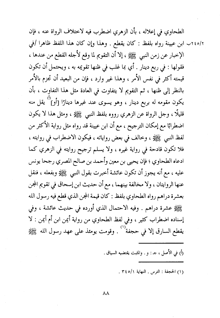 الطحاوي في إعلاله، بأن الزهريّ اضطرب فيه لاختلاف الرواة عنه، فإن ابن عيينة رواه بلفظ: كان يقطع. وهذا كان كان هذا اللفظ ظاهرا في الإخبار عن زمن النبي - صلى الله عليه وسلم -، إلا أن التقويم لما وقع لأجله القطع من عندها، فقولها: في ربع دينار. أي بما غلب في ظنها تقويمه به، ويحتمل أن تكون قيمته أكثر في نفس الأمر، وهذا غير وارد، فإن من البعيد أن تجزم بالأمر بالنظر إلى ظنها، ثم التقويم لا يتفاوت في العادة مثل هذا التفاوت، بأن يكون مقومه له بربع دينار، وهو يسوى عند غيرها دينارًا [أو] (أ) يقل منه قليلًا، وجل الرواة عن الزهريّ رووه بلفظ النبي - صلى الله عليه وسلم -، ومثل هذا لا يكون اضطرابًا مع إمكان الترجيح، مع أن ابن عيينة قد رواه مثل رواية الأكثر من لفظ النبي - صلى الله عليه وسلم -، وخالف في بعض رواياته، فيكون الاضطراب في روايته، فلا تكون قادحة في رواية غيره، ولا يسلم ترجيح روايته في الزهريّ كما ادعاه الطحاوي؛ فإن يحيى بن معين وأحمد بن صالح المصري رجحا يونس عليه، مع أنه يجوز أن تكون عائشة أخبرت يقول النبي - صلى الله عليه وسلم - وبفعله، فنقل عنها الروايتان، ولا مخالفة بينهما، مع أن حديث ابن إسحاق في تقويم المجن بعشرة دراهم رواه الطحاوي بلفظ: كان قيمة المجن الذي قطع فيه رسول الله - صلى الله عليه وسلم - عشرة دراهم. وفيه الاحتمال الذي أورده في حديث عائشة، وفي إسناده اضطراب كثير، وفي لفظ الطحاوي من رواية أيمن ابن أم أيمن: لا يقطع السارق إلا في حجفة (¬1). وقومت يومئذ على عهد رسول الله - صلى الله عليه وسلم -