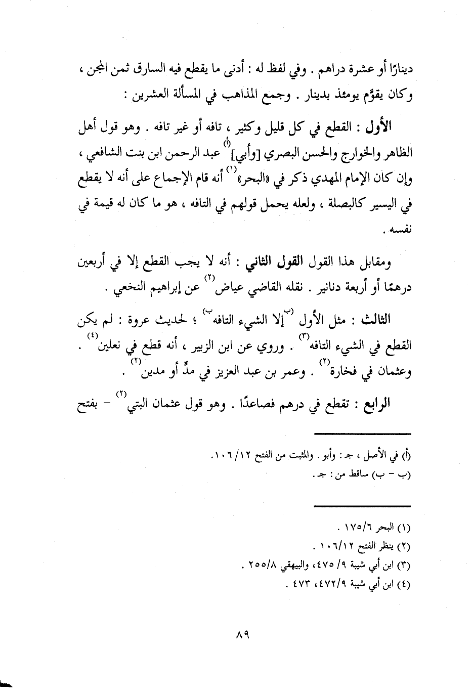 الثالث: مثل الأول (ب إلا الشيء التافه ب)؛ لحديث عروة: لم يكن القطع في الشيء التافه (¬3). وروي عن ابن الزبير، أنه قطع في نعلين (¬4). وعثمان في فخارة (2). وعمر بن عبد العزيز في مد أو مدين (2).