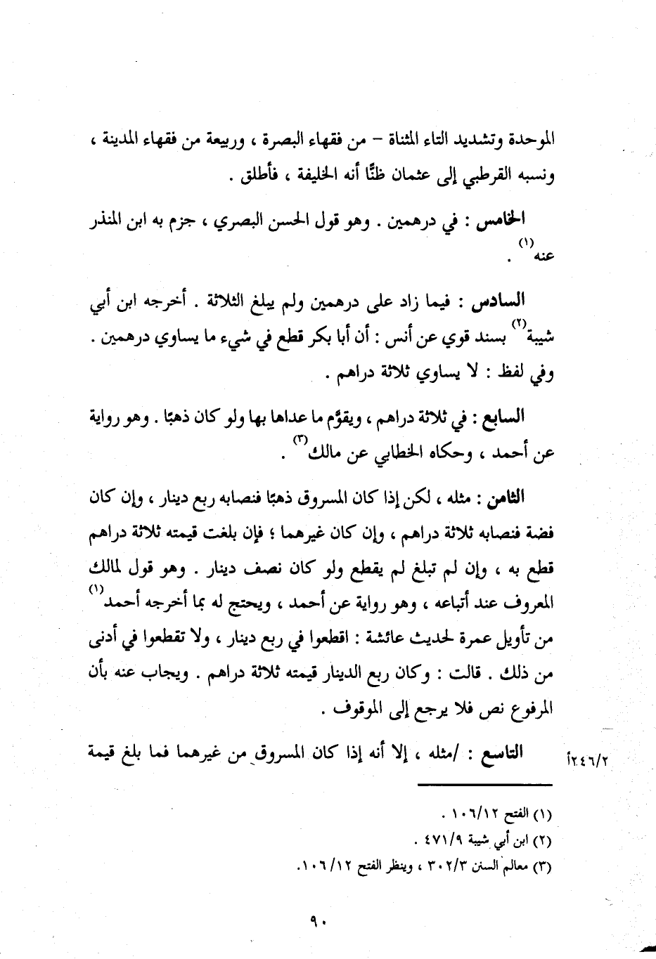 الثامن: مثله، لكن إذا كان المسروق ذهبًا فنصابه ربع دينار، وإن كان فضة فنصابه ثلاثة دراهم، وإن كان غيرهما؛ فإن بلغت قيمته ثلاثة دراهم قطع به، وإن لم تبلغ لم يقطع ولو كان نصف دينار. وهو قول لمالك المعروف عند أتباعه، وهو رواية عن أحمد، ويحتج له بما أخرجه أحمد (1) من تأويل عمرة لحديث عائشة: اقطعوا في ربع دينار، ولا تقطعوا في أدنى من ذلك. قالت: وكان ربع الدينار قيمته ثلاثة دراهم. ويجاب عنه بأن المرفوع نص فلا يرجع إلى الموقوف.