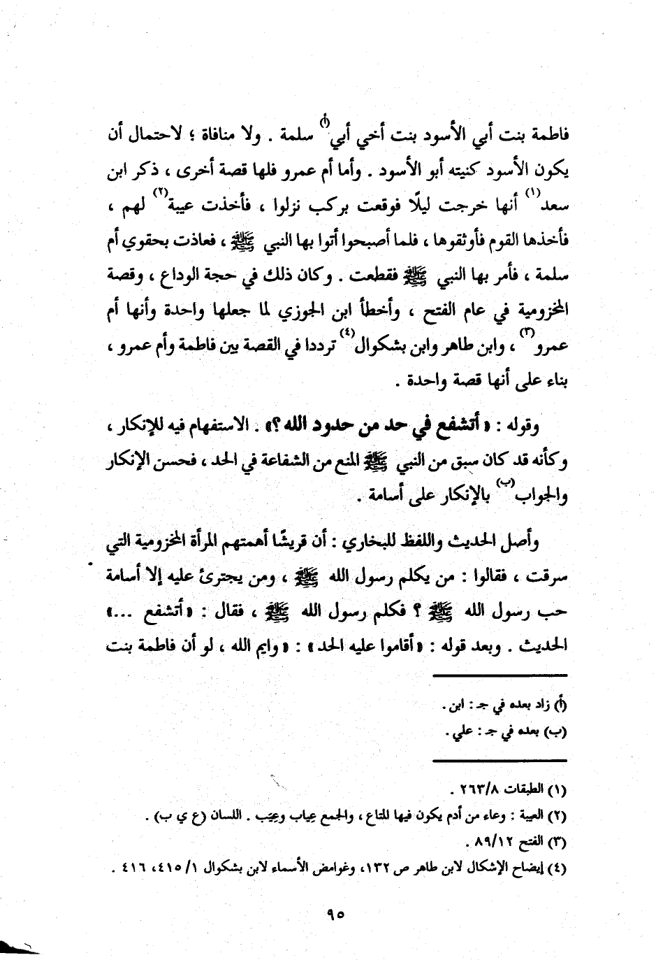 فاطمة بنت أبي الأسود بنت أخي أبي (أ) سلمة. ولا منافاة؛ لاحتمال أن يكون الأسود كنيته أبو الأسود. وأما أم عمرو فلها قصة أخرى، ذكر ابن سعد (¬1) أنها خرجت ليلًا فوقعت بركب نزلوا، فأخذت عيبة (¬2) لهم، فأخذها القوم فأوثقوها، فلما أصبحوا أتوا بها النبي - صلى الله عليه وسلم -، فعاذت بحقوي أم سلمة، فأمر بها النبي - صلى الله عليه وسلم - فقطعت. وكان ذلك في حجة الوداع، وقصة المخزومية في عام الفتح، وأخطأ ابن الجوزي لما جعلها واحدة وأنها أم عمرو (¬3)، وابن طاهر وابن بشكوال (¬4) ترددا في القصة بين فاطمة وأُم عمرو، بناء على أنها قصة واحدة.