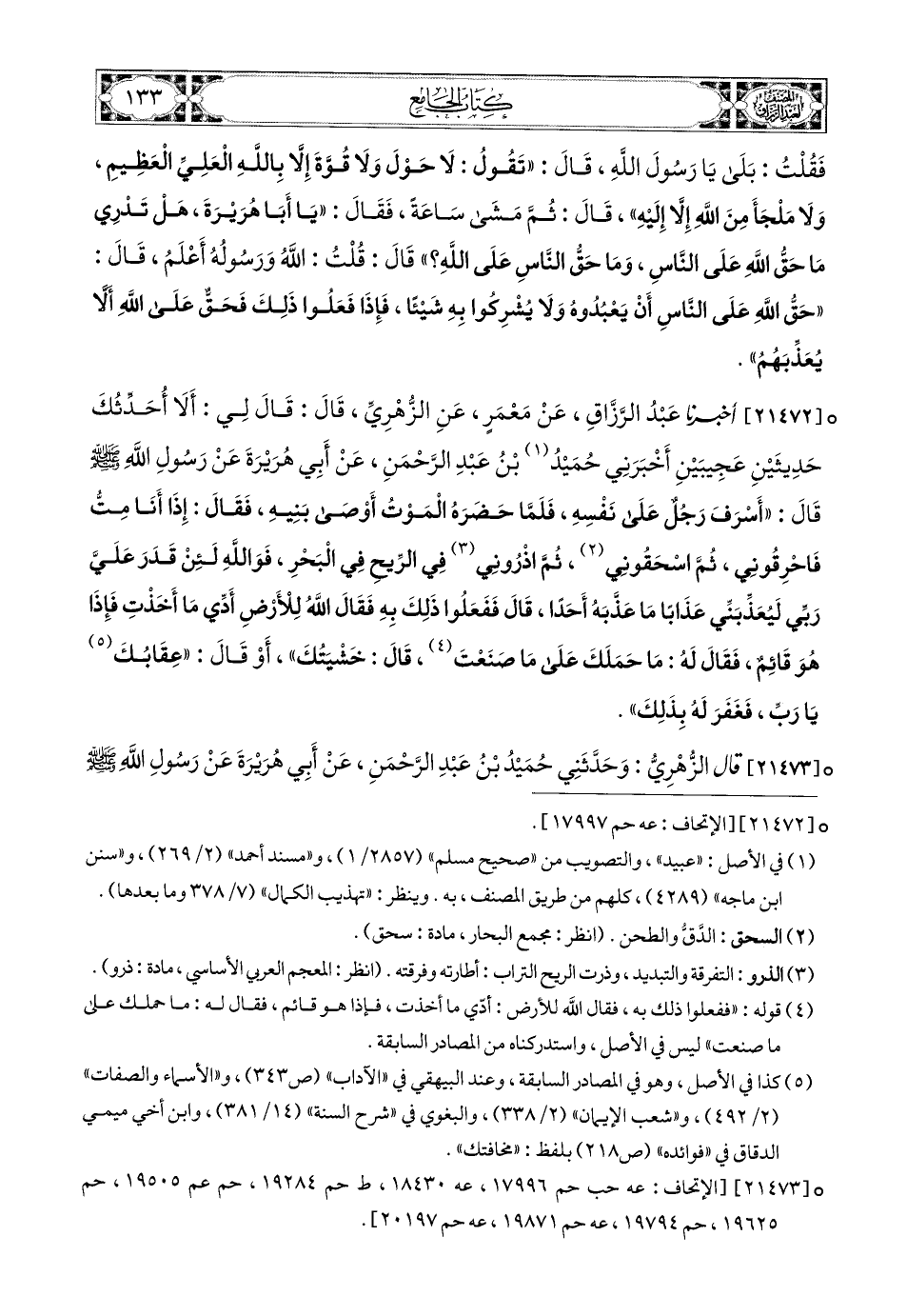 21472- أخبرنا عبد الرزاق، عَنْ مَعْمَرٍ، عَنِ الزُّهْرِيِّ، قَالَ: قَالَ لِي: أَلاَ أُحَدِّثُكَ حَدِيثَيْنِ عَجِيبَيْنِ: أَخْبَرَنِي حُمَيْدُ بن عَبدِ الرَّحْمَنِ، عَنْ أَبِي هُرَيرَةَ، عَن رَسُولِ اللهِ صَلَّى اللهُ عَلَيْهِ وَسَلَّمَ قَالَ: أَسْرَفَ رَجُلٌ عَلَى نَفْسِهِ، فَلَمَّا حَضَرَهُ المَوْتُ، أَوْصَى بَنِيهِ، فَقَالَ: إِذَا أَنَا مِتُّ، فَاحْرِقُونِي، ثُمَّ اسْحَقُونِي، ثُمَّ اذْرُونِي فِي الرِّيحِ فِي الْبَحْرِ، فَوَاللهِ لَئِنْ قَدَرَ عَلَيَّ رَبِّي لَيُعَذِّبَنِّي عَذَابًا مَا عَذَّبَهُ أَحَدًا، قال: ففعلوا ذلك به، فقال الله للأرض أدي ما أخذت، فإذا هو قائم، فقال له: ما حملك على ما صنعت؟ قَالَ: خَشْيَتَكَ، أَوْ قَالَ: عِقَابَكَ يَا رَبِّ، فَغَفَرَ لَهُ بِذَلِكَ.