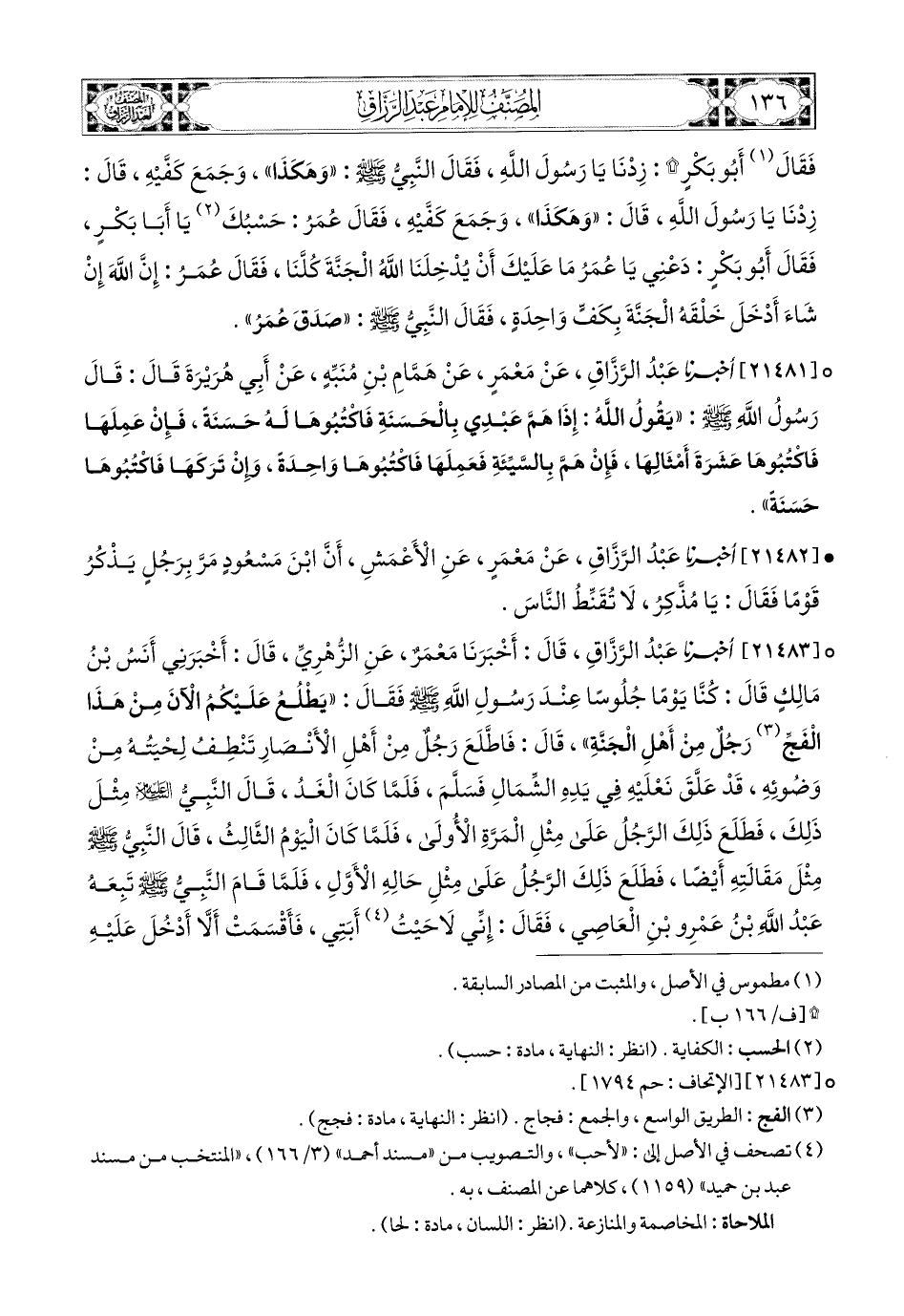 21483- أخبرنا عبد الرزاق، قَالَ: أَخْبَرَنَا مَعْمَرٌ، عَنِ الزُّهْرِيِّ، قَالَ: أَخْبَرَنِي أَنَسُ بن مَالِكٍ، قَالَ: كُنَّا يَوْمًا جُلُوسًا عِنْدَ رَسُولِ اللهِ صَلَّى اللهُ عَلَيْهِ وَسَلَّمَ فَقَالَ: يَطْلُعُ عَلَيْكُمُ الآنَ مِنْ هَذَا الْفَجِّ رَجُلٌ مِنْ أَهْلِ الْجَنَّةِ، قَالَ: فَاطَّلَعَ رَجُلٌ مِنْ أَهْلِ الأَنْصَارِ تَنْطِفُ لِحْيَتُهُ مِنْ وُضُوئِهِ، قَدْ عَلَّقَ نَعْلَيْهِ فِي يَدِهِ الشِّمَالِ فَسَلَّمَ، فَلَمَّا كَانَ الْغَدُ، قَالَ النَّبِيُّ عَلَيْهِ السَّلاَم مِثْلَ ذَلِكَ، فَطَلَعَ ذَلِكَ الرَّجُلُ عَلَى مِثْلِ المَرَّةِ الأُولَى، فَلَمَّا كَانَ الْيَوْمُ الثَّالِثُ، قَالَ النَّبِيُّ صَلَّى اللهُ عَلَيْهِ وَسَلَّمَ مِثْلَ مَقَالَتِهِ أَيْضًا، فَطَلَعَ ذَلِكَ الرَّجُلُ عَلَى مِثْلِ حَالِهِ الأَوَّلِ، فَلَمَّا قَامَ النَّبِيُّ صَلَّى اللهُ عَلَيْهِ وَسَلَّمَ تَبِعَهُ عَبدُ اللهِ بن عَمْرِو بنِ الْعَاصِي فَقَالَ: إِنِّي لاَحَيْتُ أَبَتِي، فَأَقْسَمْتُ أَلاَّ أَدْخُلَ عَلَيْهِ ثَلاَثًا، فَإِنْ رَأَيْتَ أَنْ تُؤْوِيَنِي إِلَيْكَ حَتَّى تَمْضِيَ الثَّلاَثُ فَعَلْتَ، قَالَ: نَعَمْ، قَالَ أَنَسٌ: كَانَ عَبدُ اللهِ يُحَدِّثُ أَنَّهُ بَاتَ مَعَهُ ثَلاَثَ لَيَالٍ، فَلَمْ يَرَهُ يَقُومُ مِنَ اللَّيْلِ شَيْئًا، غَيْرَ أَنَّهُ إِذَا تَعَارَّ انْقَلَبَ عَلَى فِرَاشِهِ، ذَكَرَ اللهَ، وَكَبَّرَ، حَتَّى يَقُومَ لِصَلاَةِ الْفَجْرِ، قَالَ عَبدُ اللهِ: غير أَنِّي لَمْ أَسْمَعْهُ يَقُولُ إِلاَّ خَيْرًا، فَلَمَّا مَضَتِ الثَّلاَثُ (1)، وَكِدْتُ أَحْتَقِرُ عَمَلَهُ، قُلْتُ: يَا عَبدَ اللهِ، لَمْ يَكُنْ بَيْنِي وَبَيْنَ وَالِدِي هِجْرَةٌ، وَلاَ غَضَبٌ، وَلَكِنِّي سَمِعْتُ رَسُولَ اللهِ صَلَّى اللهُ عَلَيْهِ وَسَلَّمَ يَقُولُ ثَلاَثَ مَرَّاتٍ: يَطْلُعُ الآنَ عَلَيْكُمْ رَجُلٌ مِنْ أَهْلِ الْجَنَّةِ، فَاطَّلَعْتَ ثَلاَثَ مَرَّاتٍ، فَأَرَدْتُ أَنْ آوِيَ إِلَيْكَ، لأَنْظُرَ مَا عَمَلُكَ، فَأَقْتَدِيَ بِكَ، فَلَمْ أَرَكَ تَعْمَلُ كَبِيرَ عَمَلٍ (2)، فَمَا الَّذِي بَلَغَ بِكَ مَا قَالَ رَسُولُ اللهِ صَلَّى اللهُ عَلَيْهِ وَسَلَّمَ؟ قَالَ: مَا هُوَ إِلاَّ مَا رَأَيْتَ، قَالَ: فَانْصَرَفْتُ عَنْهُ، فَلَمَّا وَلَّيْتُ، دَعَانِي، فَقَالَ: مَا هُوَ إِلاَّ مَا رَأَيْتَ، غَيْرَ أَنِّي لاَ أَجِدُ فِي نَفْسِي عَلَى أَحَدٍ مِنَ المُسْلِمِينَ غِشًّا، وَلاَ أَحْسُدُهُ عَلَى مَا أَعْطَاهُ اللهُ إِيَّاهُ، فَقَالَ عَبدُ اللهِ: هَذِهِ الَّتِي بَلَغَتْ بِكَ وَهِيَ الَّتِي لاَ نُطِيقُ.