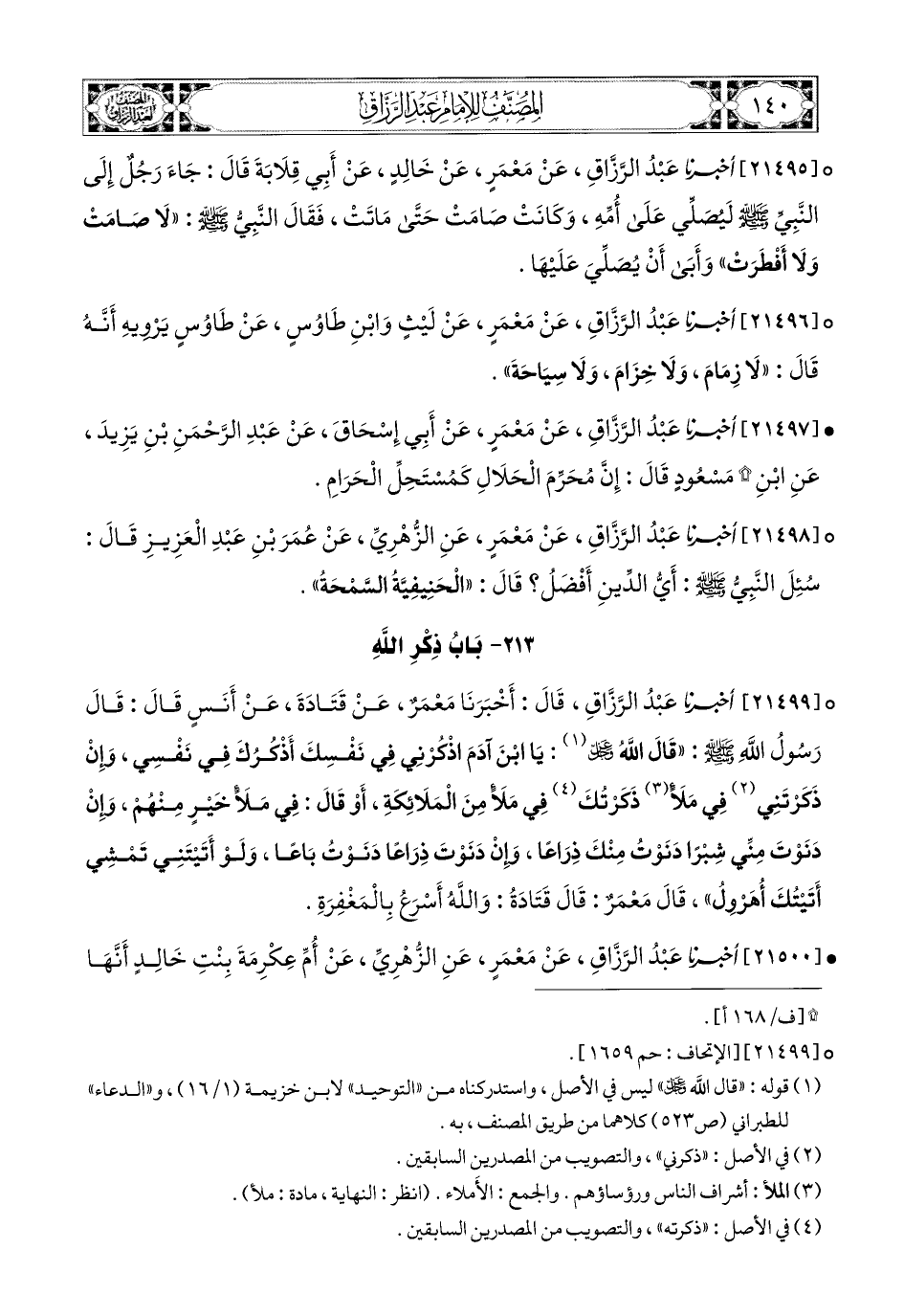 21499- أخبرنا عبد الرزاق، قَالَ: أَخْبَرَنَا مَعْمَرٌ، عَن قَتَادَةَ، عَنْ أَنَسٍ، قَالَ: قَالَ رَسُولُ اللهِ صَلَّى اللهُ عَلَيْهِ وَسَلَّمَ: قَالَ اللهُ عَزَّ وَجَلَّ: يَا ابْنَ آدَمَ، اذْكُرْنِي فِي نَفْسِكَ، أَذْكُرْكَ فِي نَفْسِي، وَإِنْ ذَكَرْتَنِي فِي مَلإٍ، ذَكَرْتُكَ فِي مَلإٍ مِنَ المَلاَئِكَةِ، أَوْ قَالَ: فِي مَلإٍ خَيْرٍ مِنْهُمْ، وَإِنْ دَنَوْتَ مِنِّي شِبْرًا، دَنَوْتُ مِنْكَ ذِرَاعًا، وَإِنْ دَنَوْتَ ذِرَاعًا، دَنَوْتُ بَاعًا، وَلَوْ أَتَيْتَنِي تَمْشِي أَتَيْتُكَ أُهَرْوِلُ.
