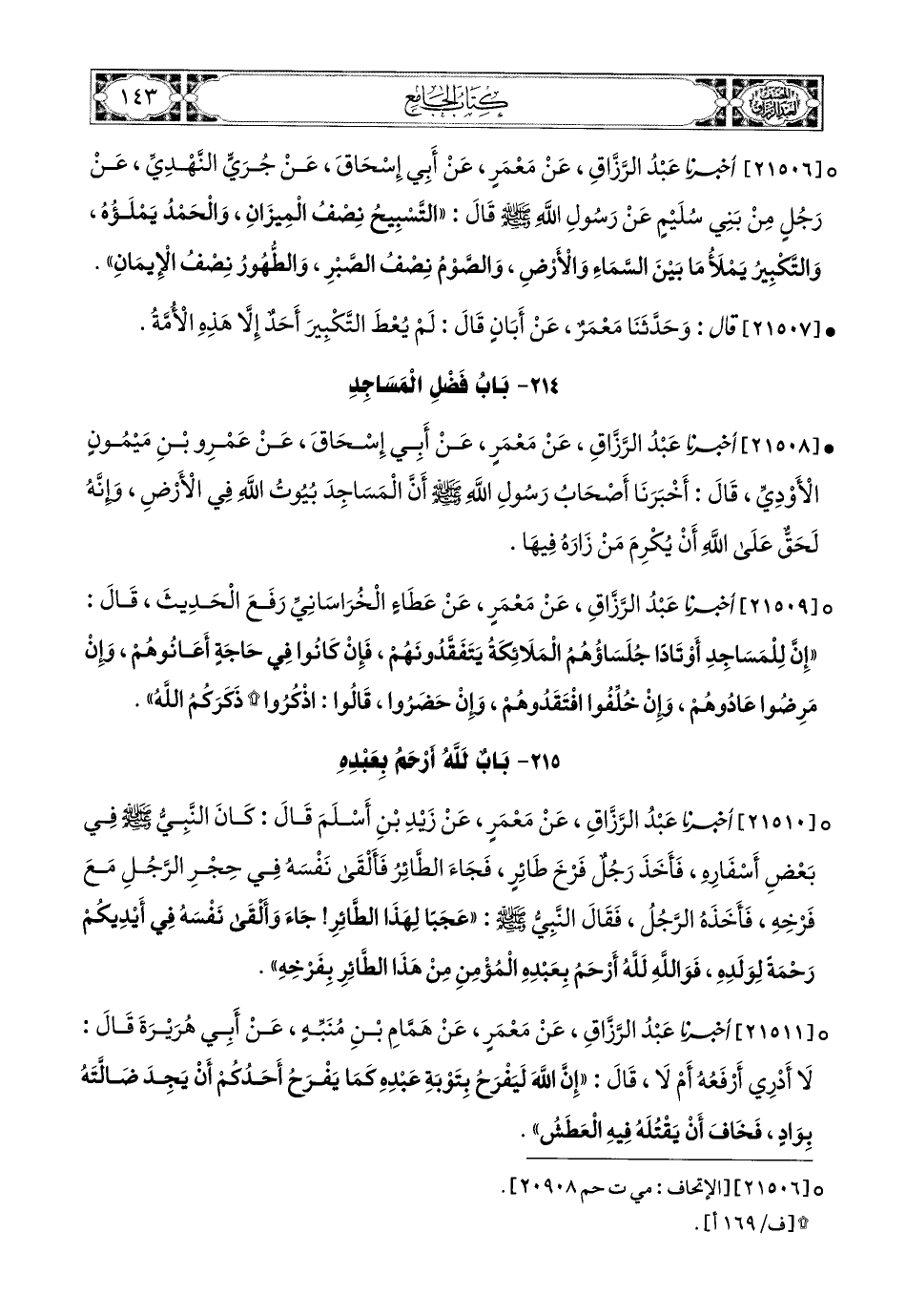21508- أخبرنا عبد الرزاق، عَنْ مَعْمَرٍ، عَنْ أَبِي إِسْحَاقَ، عَنْ عَمْرِو بنِ مَيْمُونٍ الأَوْدِيِّ، قَالَ: أَخْبَرَنَا أَصْحَابُ رَسُولِ اللهِ صَلَّى اللهُ عَلَيْهِ وَسَلَّمَ؛ أَنَّ المَسَاجِدَ بُيُوتُ اللهِ فِي الأَرْضِ، وَإِنَّهُ لَحَقٌّ عَلَى اللهِ أَنْ يُكْرِمَ مَنْ زَارَهُ فِيهَا.