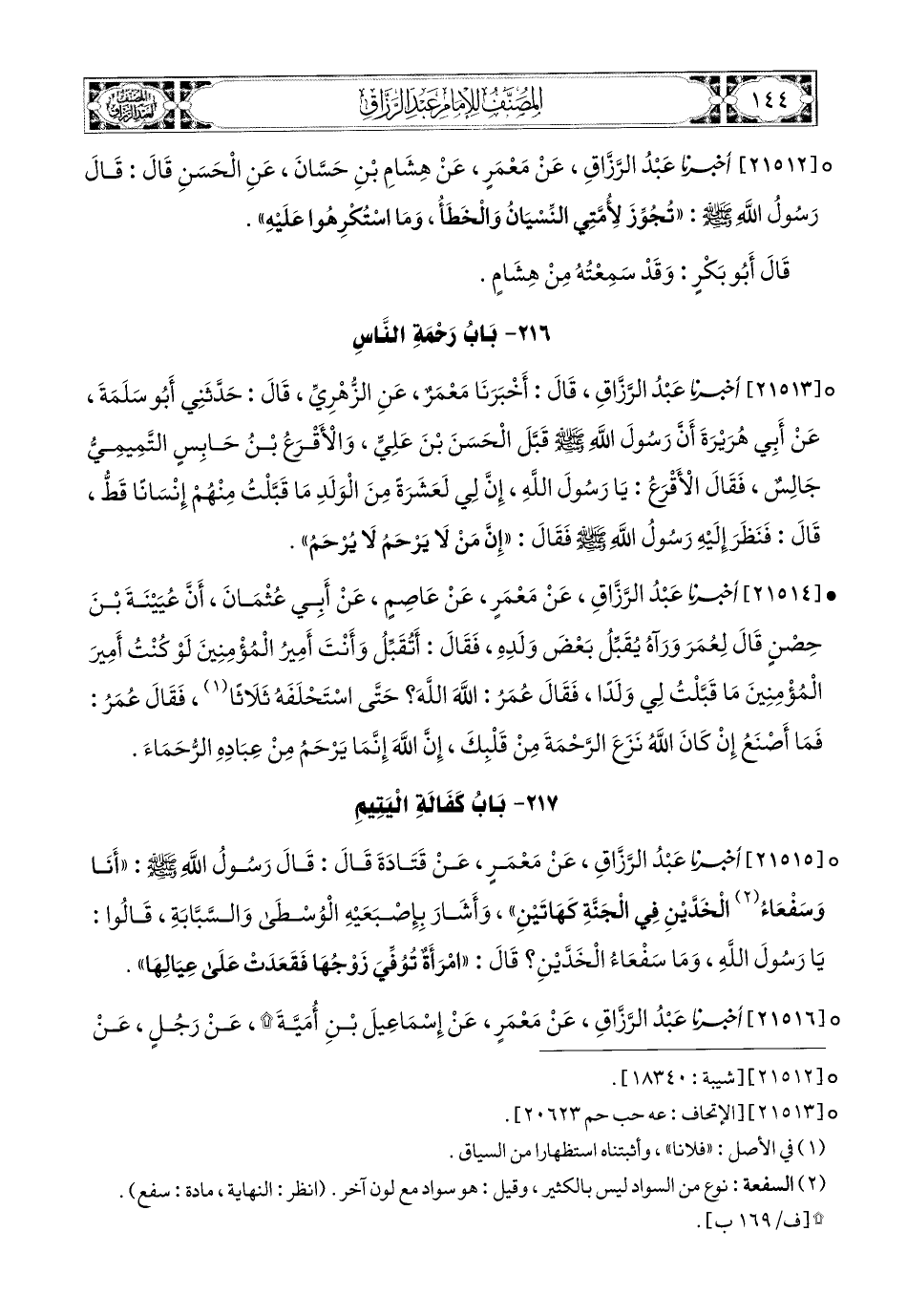 21514- أخبرنا عبد الرزاق، عَنْ مَعْمَرٍ، عَنْ عَاصِمٍ، عَنْ أَبِي عُثْمَانَ، أَنَّ عُيَيْنَةَ بن حِصْنٍ قَالَ لِعُمَرَ، وَرَآهُ يُقَبِّلُ بَعْضَ وَلَدِهِ، فَقَالَ: أَتُقَبِّلُ، وَأَنْتَ أَمِيرُ المُؤْمِنِينَ؟ لَوْ كُنْتُ أَمِيرَ المُؤْمِنِينَ مَا قَبَّلْتُ لِي وَلَدًا، فَقَالَ عُمَرُ: اللهَ اللهَ؟ حَتَّى اسْتَحْلَفَهُ ثَلاَثًا، فَقَالَ عُمَرُ: فَمَا أَصْنَعُ إِنْ كَانَ اللهُ نَزَعَ الرَّحْمَةَ مِنْ قَلْبِكَ، إِنَّ اللهَ إِنَّمَا يَرْحَمُ مِنْ عِبَادِهِ الرُّحَمَاءَ.