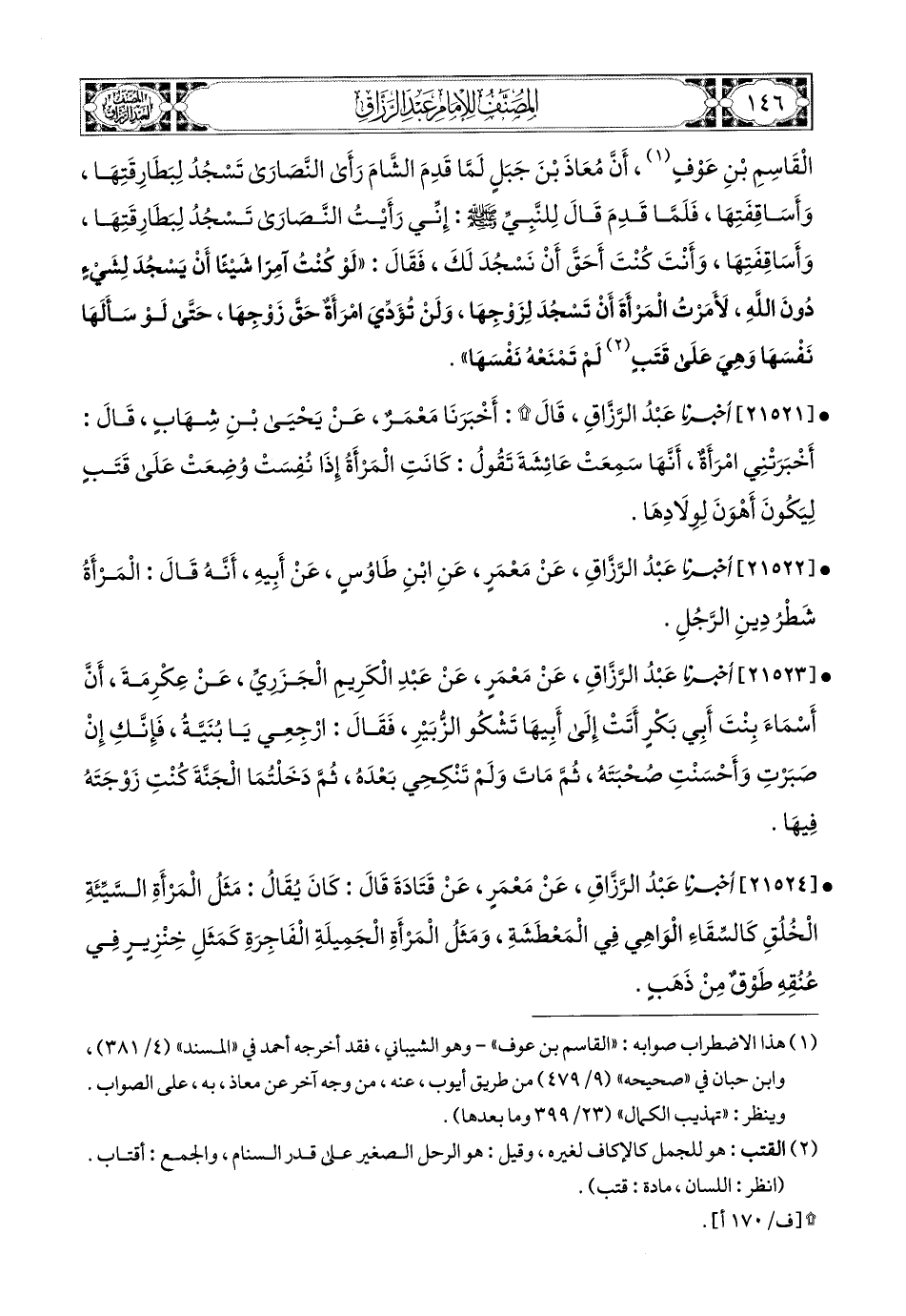 21522- أخبرنا عبد الرزاق، عَنْ مَعْمَرٍ، عَنِ ابْنِ طَاوُوسٍ، عَنْ أَبِيهِ، أَنَّهُ قَالَ: المَرْأَةُ شَطْرُ دِينِ الرَّجُلِ.
