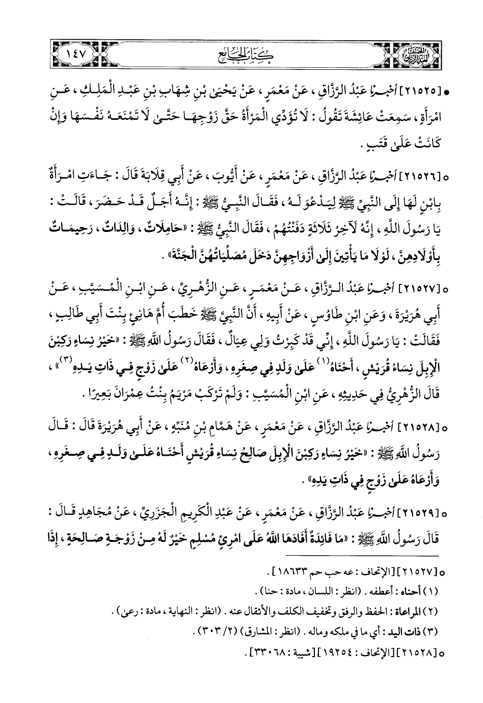 21528- أخبرنا عبد الرزاق، عَنْ مَعْمَرٍ، عَن هَمَّامِ بْنِ مُنَبِّهٍ، عَنْ أَبِي هُرَيرَةَ، قَالَ: قَالَ رَسُولُ اللهِ صَلَّى اللهُ عَلَيْهِ وَسَلَّمَ: خَيْرُ نِسَاءٍ رَكِبْنَ الإِبِلَ صَالِحُ (1) نِسَاءِ قُرَيْشٍ، أَحْنَاهُ عَلَى وَلَدٍ فِي صِغَرِهِ، وَأَرْعَاهُ عَلَى زَوْجٍ فِي ذَاتِ يَدِهِ.