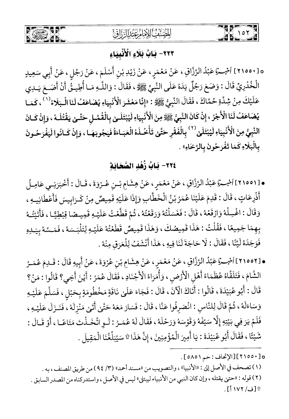 21550- أخبرنا عبد الرزاق، عَنْ مَعْمَرٍ، عَن زَيْدِ بْنِ أَسْلَمَ، عَن رَجُلٍ، عَنْ أَبِي سَعيدٍ الْخُدْرِيِّ، قَالَ: وَضَعَ رَجُلٌ يَدَهُ عَلَى النَّبِيِّ صَلَّى اللهُ عَلَيْهِ وَسَلَّمَ فَقَالَ: وَاللهِ مَا أُطِيقُ أَنْ أَضَعَ يَدِي عَلَيْكَ مِنْ شِدَّةِ حُمَّاكَ، فَقَالَ النَّبِيُّ صَلَّى اللهُ عَلَيْهِ وَسَلَّمَ: إِنَّا مَعْشَرَ الأَنْبِيَاءِ، يُضَاعَفُ لَنَا الْبَلاَءُ، كَمَا يُضَاعَفُ لَنَا الأَجْرُ، إِنْ كَانَ النَّبِيُّ صَلَّى اللهُ عَلَيْهِ وَسَلَّمَ مِنَ الأَنْبِيَاءِ لَيُبْتَلَى بِالْقُمَّلِ حَتَّى يَقْتُلَهُ، وَإِنْ كَانَ النَّبِيُّ مِنَ الأَنْبِيَاءِ لَيُبْتَلَى بِالْفَقْرِ حَتَّى تَأْخُذَهُ الْعَبَاءَةُ، فَيَجُوبَهَا، وَإِنْ كَانُوا لَيَفْرَحُونَ بِالْبَلاَءِ كَمَا تَفْرَحُونَ بِالرَّخَاءِ.