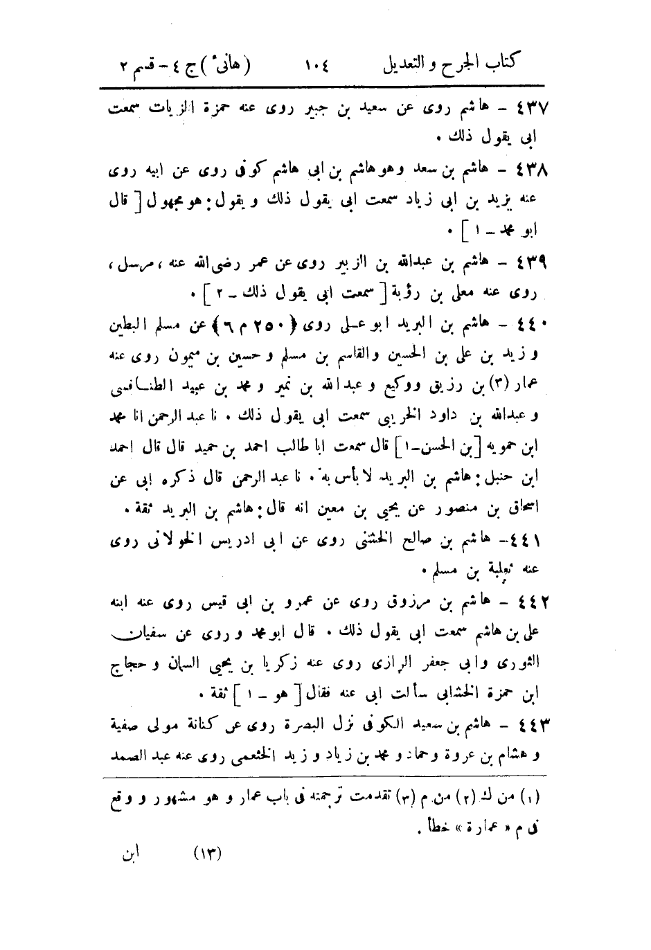 حَدثنا عَبد الرَّحمن، أَخبَرنا حرب بن إِسماعيل الكرماني، فيما كَتَبَ إلَيَّ، قال: قلت لأَحمد بن حَنبل: هاشم بن سَعيد الذي يروى عن كنانة؟ قال: ما أعرفه.
