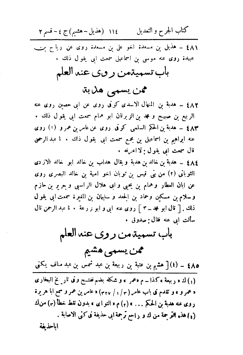 - باب تسمية من رُوي عنه العلم، مِمَّن يُسَمَّى هدبة.