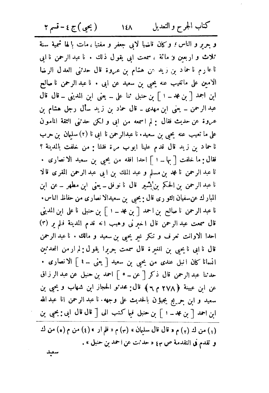 حَدثنا عَبد الرَّحمن، حَدثنا صالح بن أَحمد بن محمد بن حَنبل، حَدثنا عَلي بن المَديني، قال: سَمِعتُ عَبد الرَّحمن قال: أَخْبَرني وهيب؛ أَنه قدم المدينة فلم ير أحدًا إِلاَّ وأَنت تعرف وتنكر، غير يَحيَى بن سعيد، ومالك.