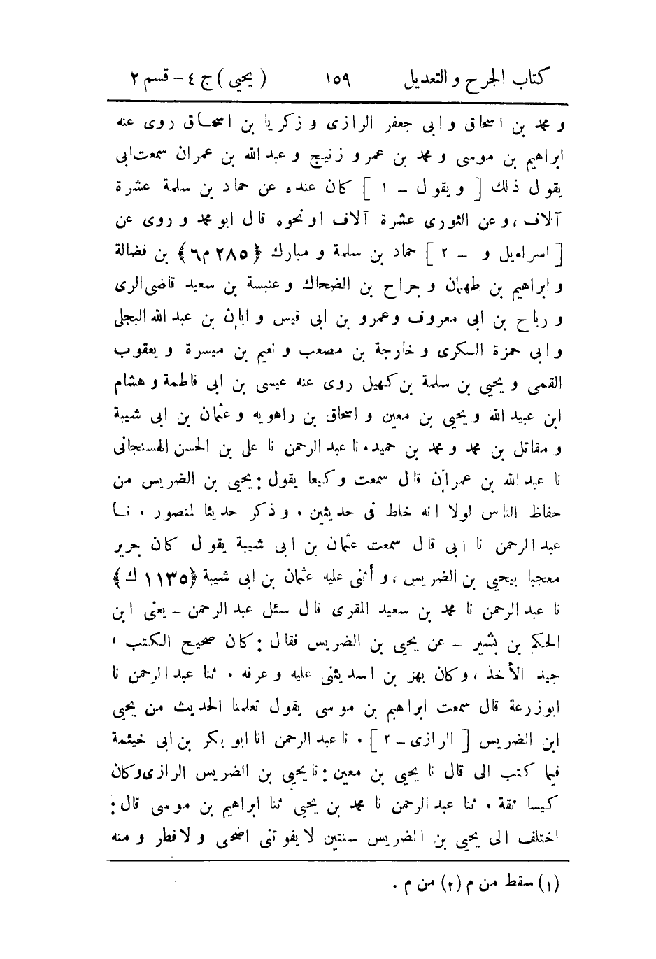 حَدثنا عَبد الرَّحمن، أَخبَرنا أَبو بكر بن أَبي خَيثمة، فيما كَتَبَ إلَيَّ، قال: حَدثنا يَحيَى بن مَعين: حَدثنا يَحيَى بن الضريس الرازي، وكان كيسا ثقة.