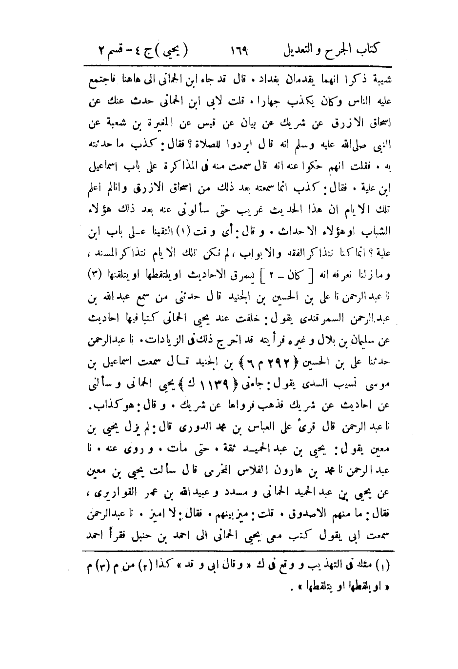 حَدثنا عَبد الرَّحمن، أَخبَرنا يعقوب بن إِسحاق الهروي، فيما كَتَبَ إلَيَّ، قال: حَدثنا عثمان بن سَعيد الدارمي، قال: سَمِعتُ يَحيَى بن مَعين يقول: ابن الحماني صدوق مشهور، ما بالكوفة مثله ما يقال فيه إِلاَّ من حسد، قال عثمان بن سعيد: كان ابن الحماني شيخا فيه غفلة، لم يكن يقدر أَن يصون نفسه كما يفعل أَصحاب الحديث.
