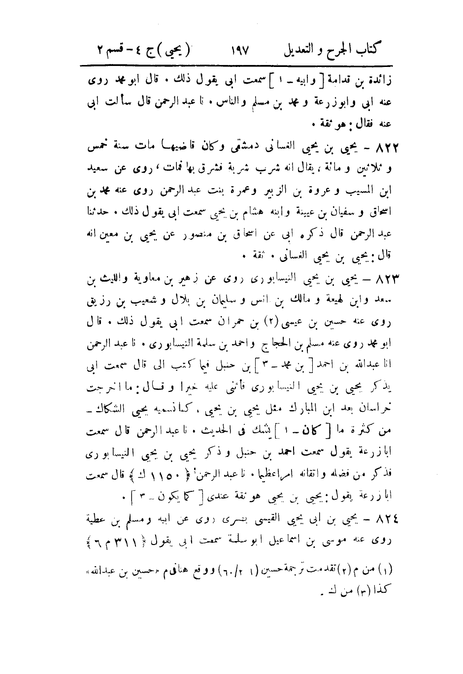 حَدثنا عَبد الرَّحمن، أَخبَرنا عَبد الله بن أَحمد بن محمد بن حَنبل، فيما كَتَبَ إِلَيَّ، قال: سَمِعتُ أَبي يذكر يَحيَى بن يَحيَى النيسابوري، فأثنى عليه خيرًا، وقال: ما أخرجت خراسان بعد ابن المبارك مثل يَحيَى بن يحيى، كنا نسميه يَحيَى الشكاك، من كثرة ما كان يشك في الحديث.