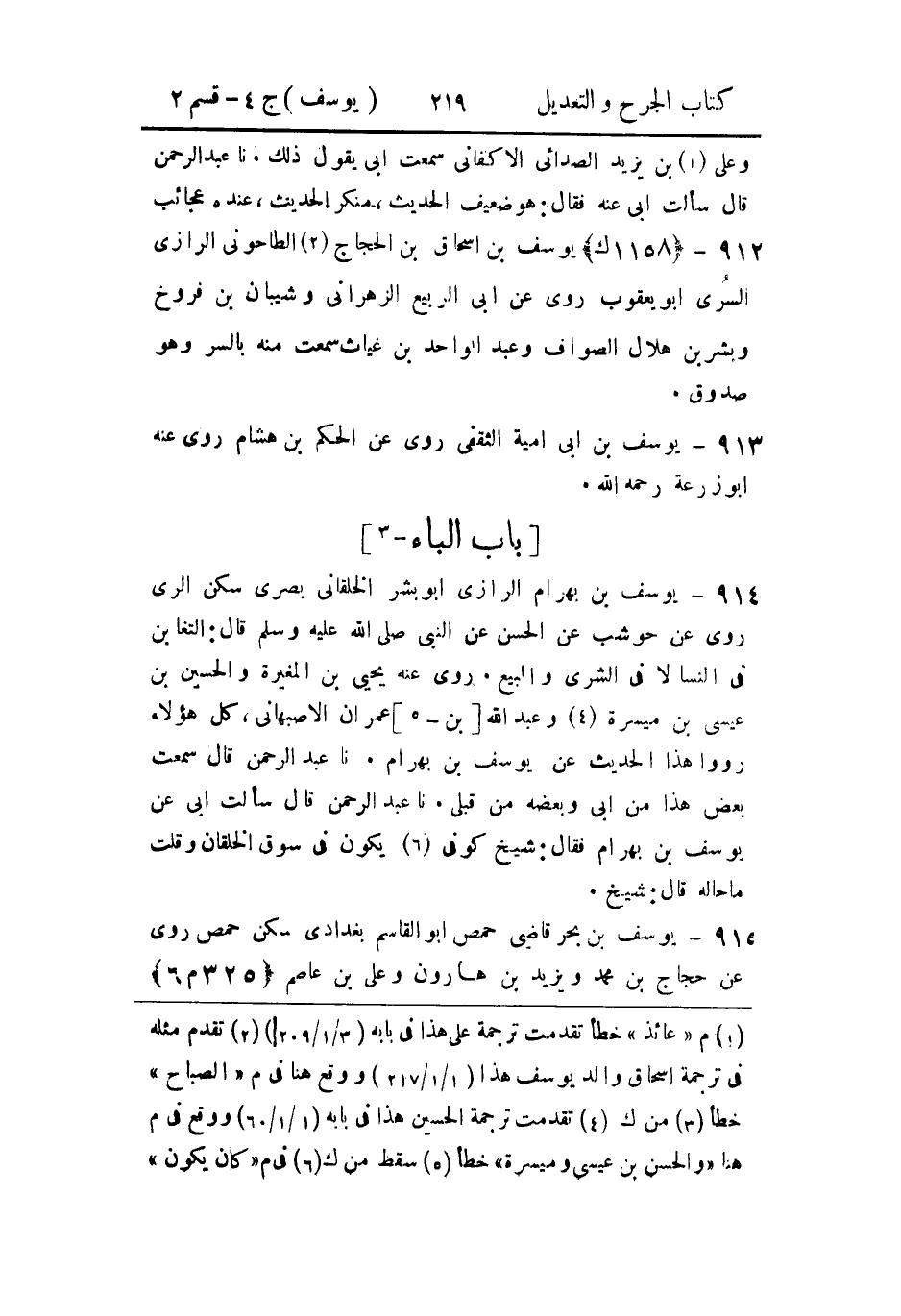 914- يوسف بن بَهْرَام الرازي، أَبو بشر الخلقاني، بَصريٌّ سكن الرَّي.