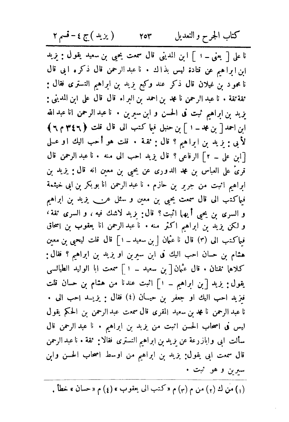 حَدثنا عَبد الرَّحمن، أَخبَرنا يعقوب بن إِسحاق، فيما كَتَبَ إِلَيَّ، قال: حَدثنا عثمان بن سعيد، قال: قلتُ ليحيى بن مَعين هشام بن حسان أَحَب إليك في ابن سيرين، أَو يزيد بن إِبراهيم؟ فقال: كلاهما ثقتان. قال عثمان بن سعيد: سَمِعتُ أبَا الوليد الطيالسي يقول: يزيد بن إِبراهيم أثبت عندنا من هشام بن حسان قلت: فيزيد أَحَب إليك، أَو جعفر بن حيان؟ فقال: يزيد أَحَبُّ إِلَيَّ.
