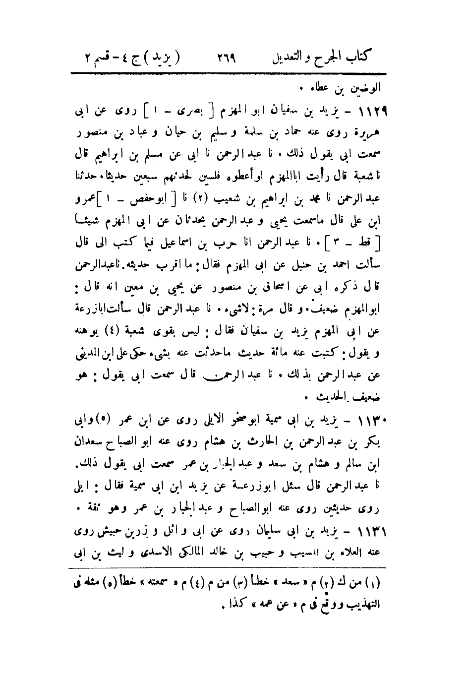 حَدثنا عَبد الرَّحمن، قال: سألت أَبَا زُرعَة عَن أَبي المهزم يزيد بن سُفيان، فقال: ليس بِقَوي، شُعبة يوهنه، ويقول: كتبت عنه مِئَة حديث، ما حدثت عنه بِشيءٍ، حكى عَلي بن المَديني عن عَبد الرَّحمن بذلك.