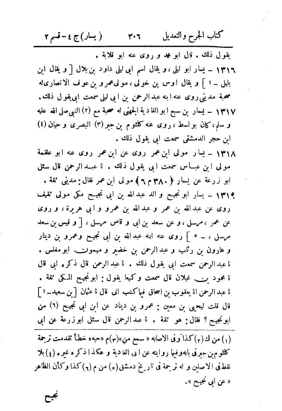 حَدثنا عَبد الرَّحمن، قال: سُئِل أَبو زُرعَة عن أبي نجيح، والد عَبد الله بن أَبي نجيح، فقال: اسمه يسار مَكّيٌّ ثقة، رَوَى عَنه ابنه عَبد الله.