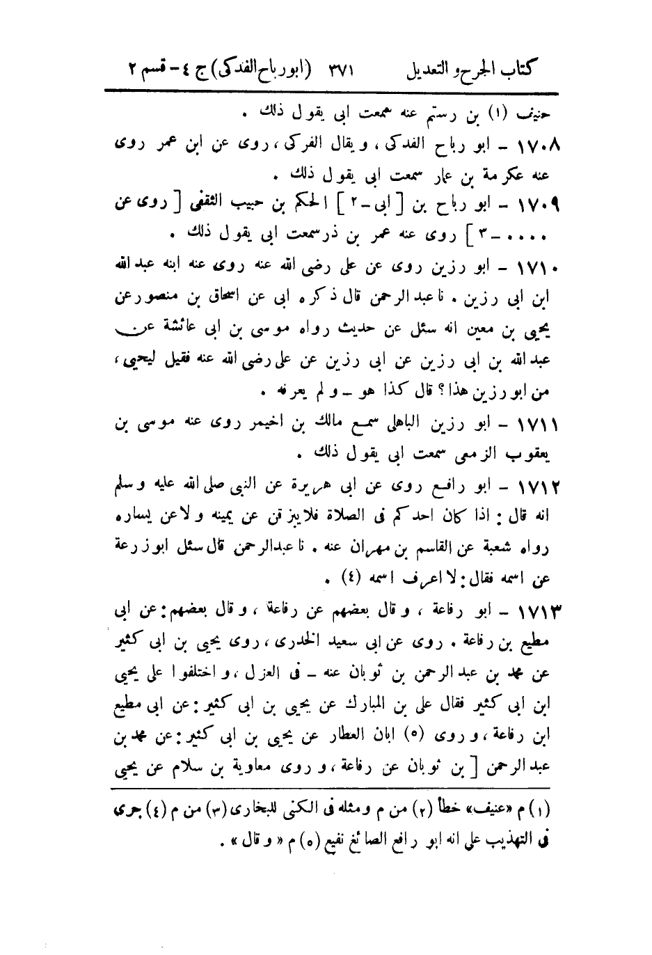 1713- أَبو رفاعة، وقال بعضهم: عن رفاعة، وقال بعضهم: عَن أَبي مطيع بن رفاعة.