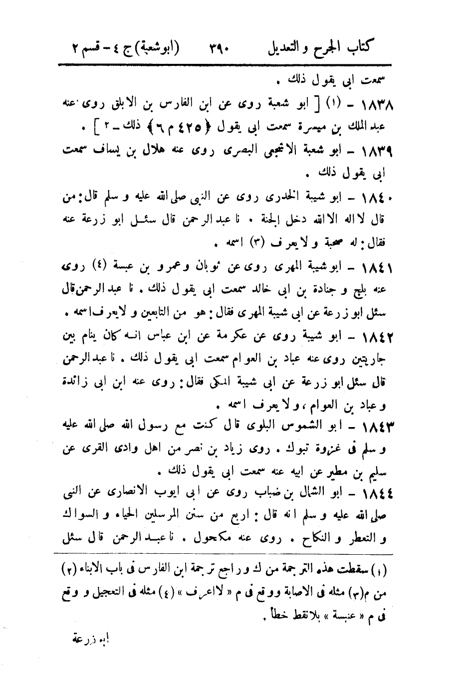 حَدثنا عَبد الرَّحمن، قال: سُئِل أَبو زُرعَة عَن أَبي شيبة المهري، فَقال: هو من التابعين، ولا يعرف اسمه.