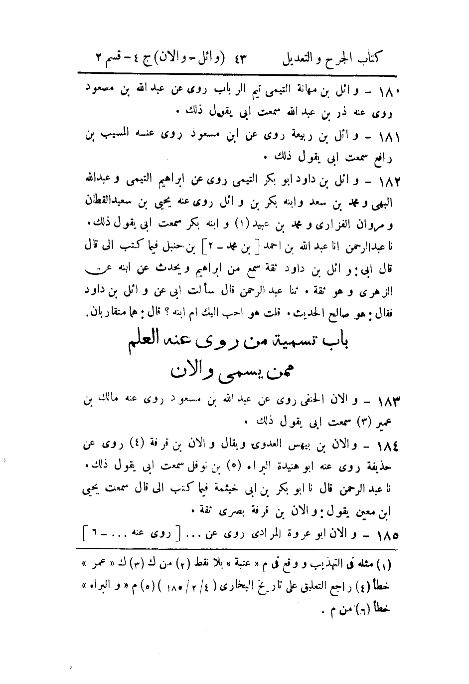 - باب تسمية من رُوي عنه العلم، مِمَّن يُسَمَّى والان.