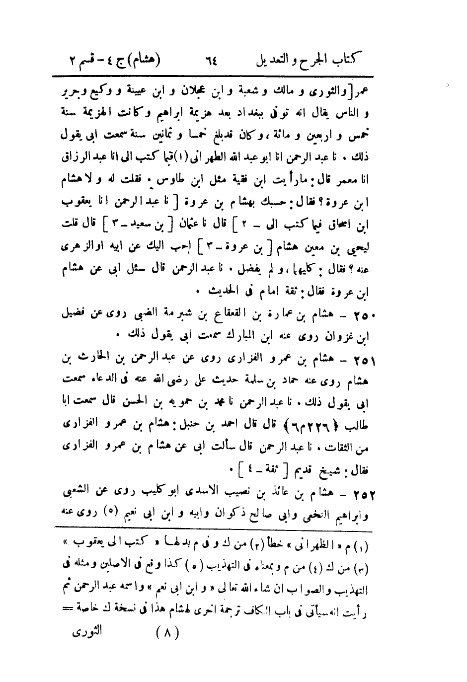حَدثنا عَبد الرَّحمن، حَدثنا محمد بن حمويه بن الحسن، قال: سَمِعتُ أبَا طالب قال: قال أَحمد بن حَنبل: هشام بن عَمرو الفَزاري من الثقات.