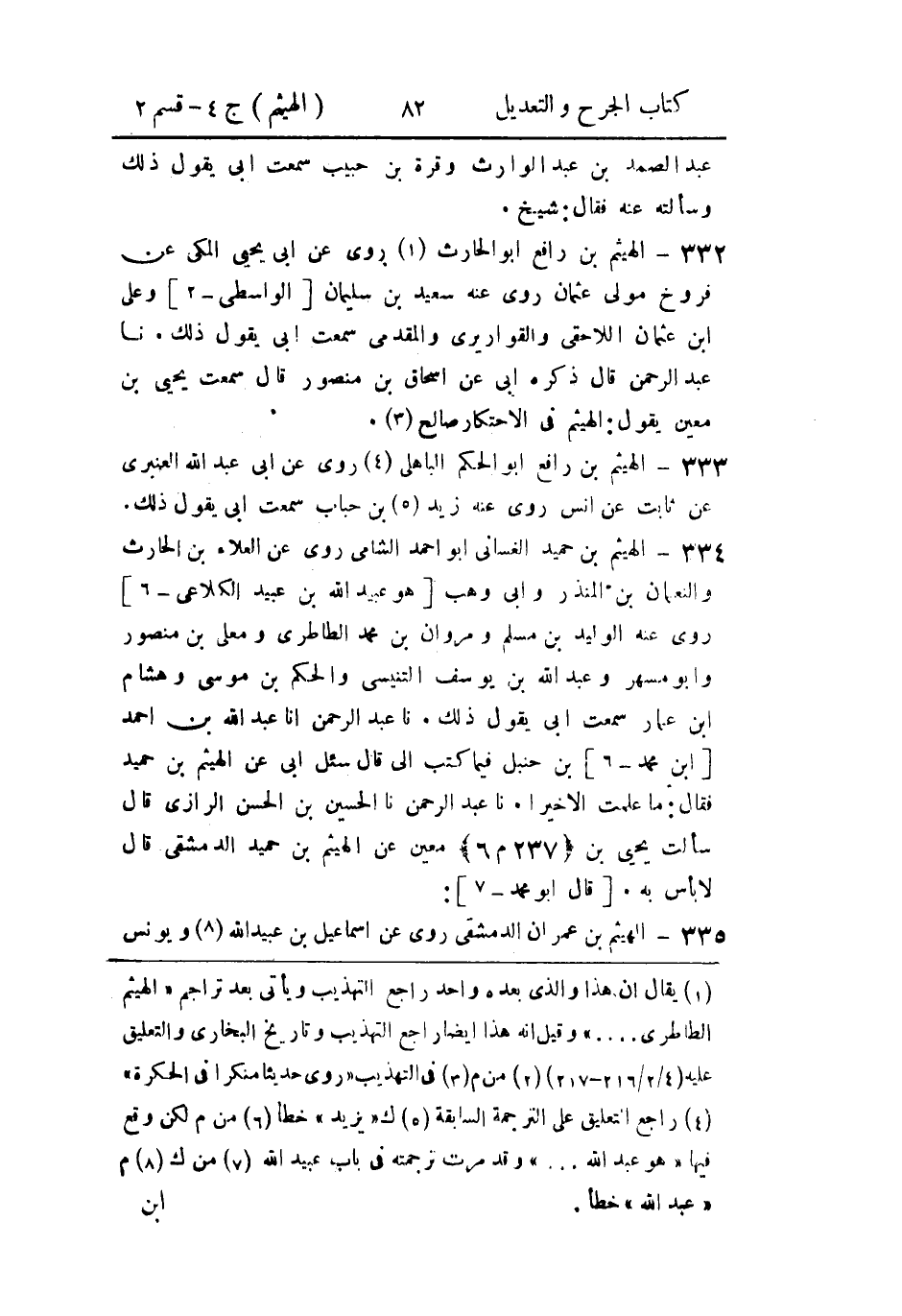 حَدثنا عَبد الرَّحمن، قال: ذَكَرَهُ أَبي، عَن إِسحاق بن منصور، قال: سَمِعتُ يَحيَى بن مَعين يقول: الهيثم في الإحتكار صالح.