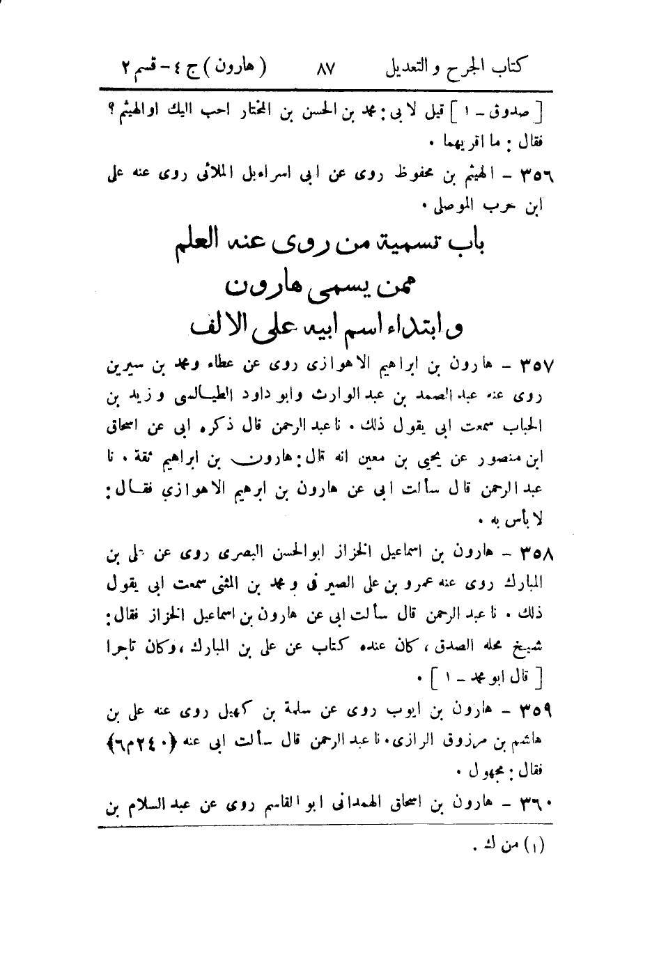 - باب تسمية من رُوي عنه العلم، مِمَّن يُسَمَّى هارون، وابتداء اسم أَبيه على الألف.