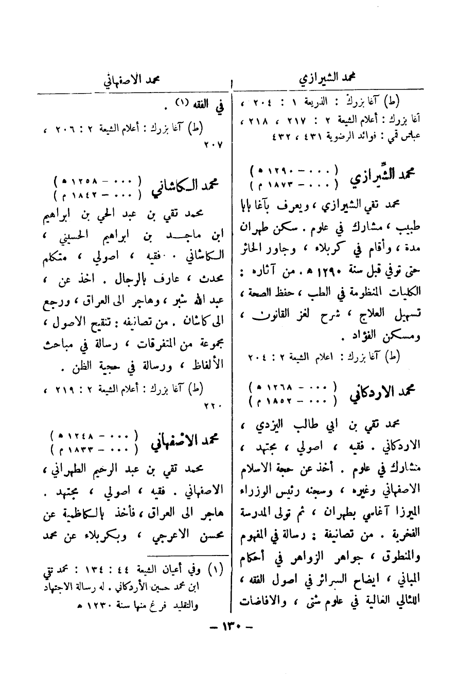 (ط) آغا بزرك: الذريعة 1: 204، آغا بزرك: أعلام الشيعة 2: 217، 218، عباس قمي: فوائد الرضوية 431، 432 محمد الشيرازي (000 - 1290 هـ) (000 - 1873 م) محمد تقي الشيرازي، ويعرف بآغا بابا طبيب، مشارك في علوم.