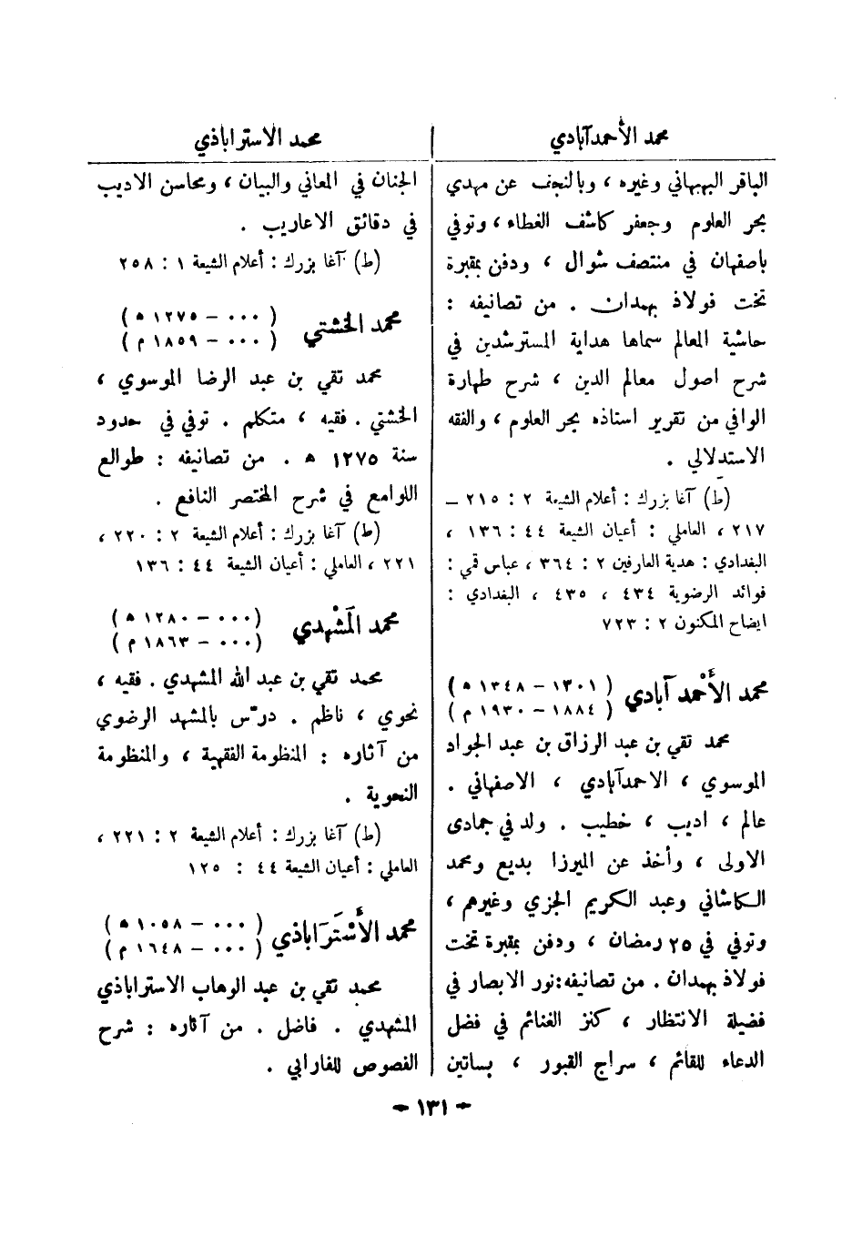 (ط) آغا بزرك: أعلام الشيعة 2: 215 - 217، العاملي: أعيان الشيعة 44: 136، البغدادي: هدية العارفين 2: 364، عباس قمي: فوائد الرضوية 434، 435، البغدادي: ايضاح المكنون 2: 723 محمد الاحمد آبادي (1301 - 1348 هـ) (1884 - 1930 م) محمد تقي بن عبد الرزاق بن عبد الجواد الموسوي، الاحمد آبادي، الاصفهاني.