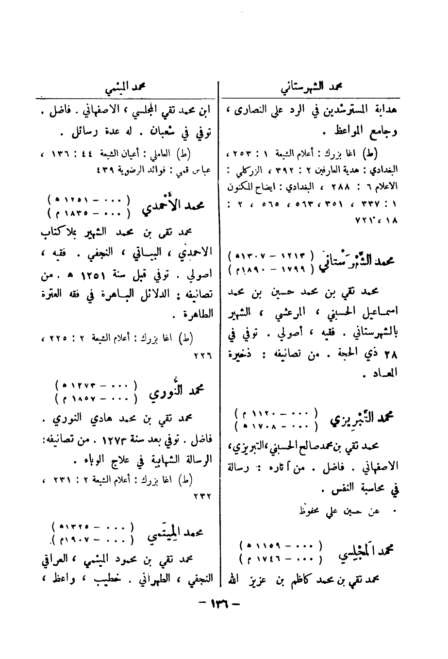 (ط) آغا بزرك: أعلام الشيعة 1: 253، البغدادي: هدية العارفين 2: 392، الزركلي: الاعلام 6: 288، البغدادي: ايضاح المكنون 1: 337، 351، 563، 565، 2: 18، 721 محمد الشهرستاني (1213 - 1307 هـ) (1799 - 1890 م) محمد تقي بن محمد حسين بن محمد اسماعيل الحسيني، المرعشي، الشهير بالشهرستاني.